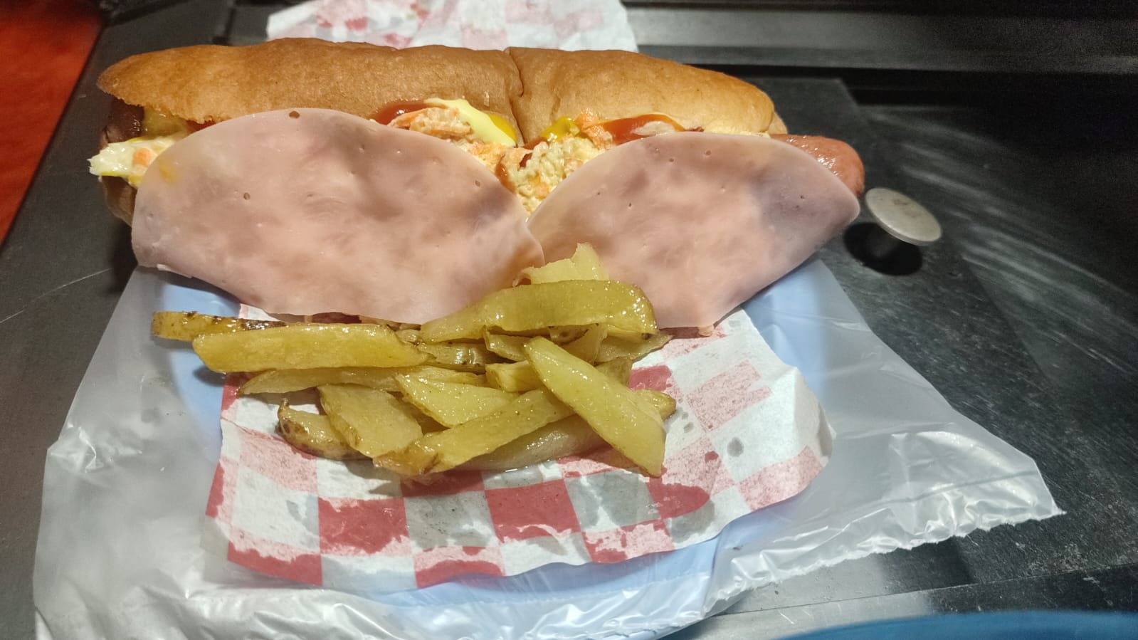 Salchicha Roja, tomate, cebolla, chile, ensalada de col con zanahoria, mayonesa, cátsup, mostaza y jamón.
