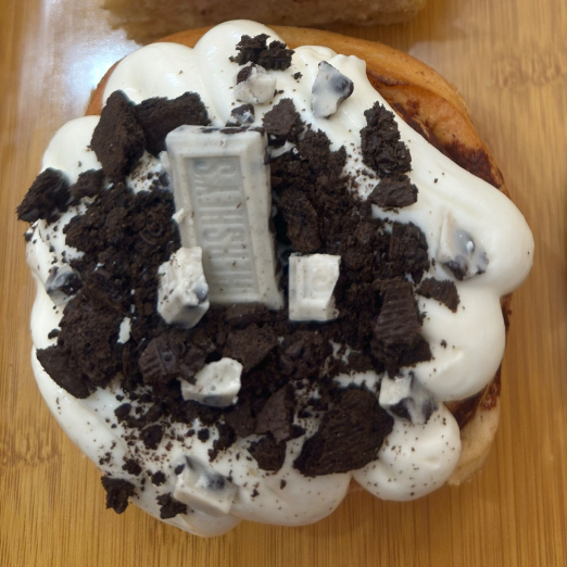 Rol de canela con glaseado, topping de galleta oreo con chocolate Hersheys