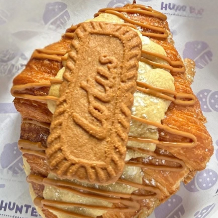 Croissant relleno y cubierto de galleta de chispas de chocolate blanco, con crema y galleta lotus