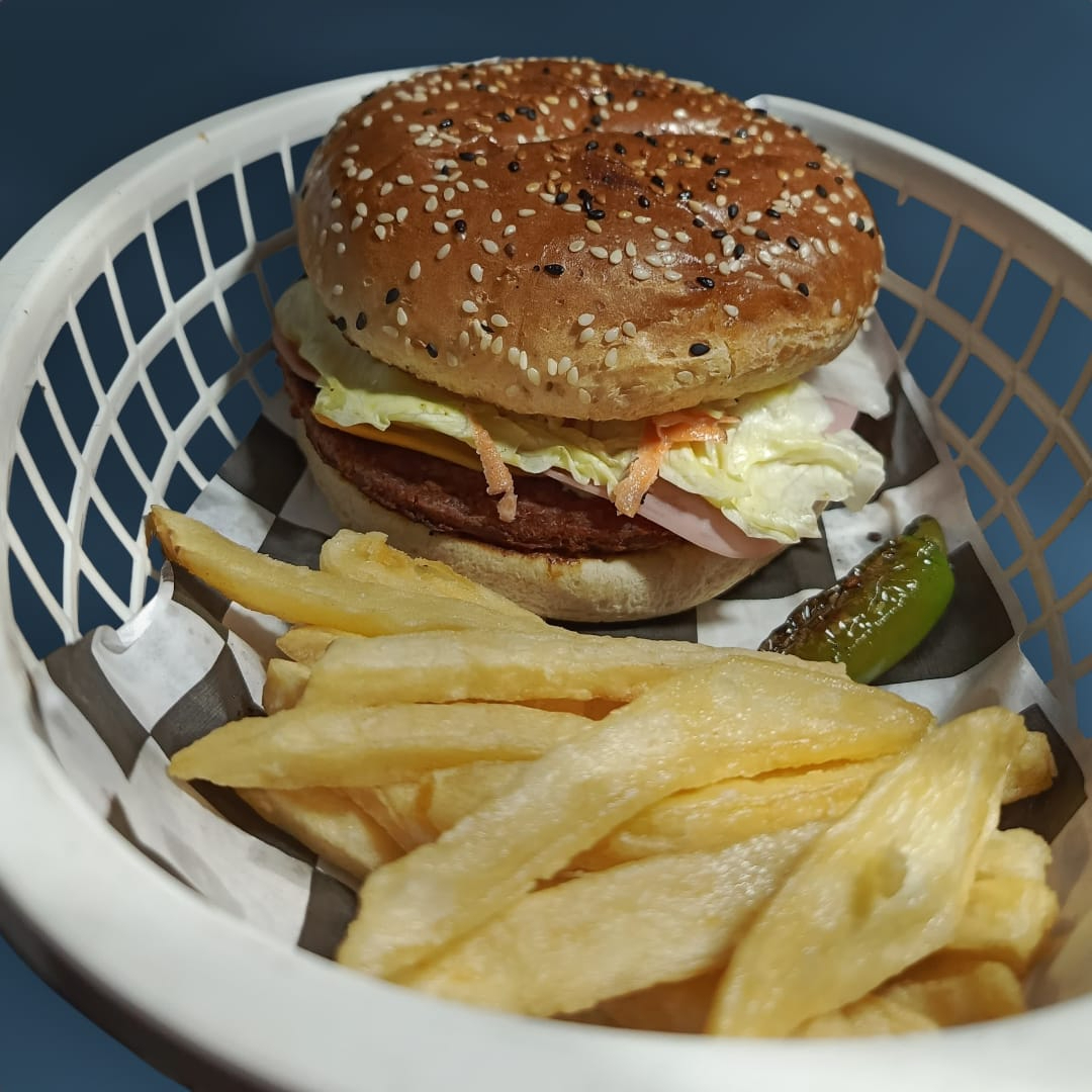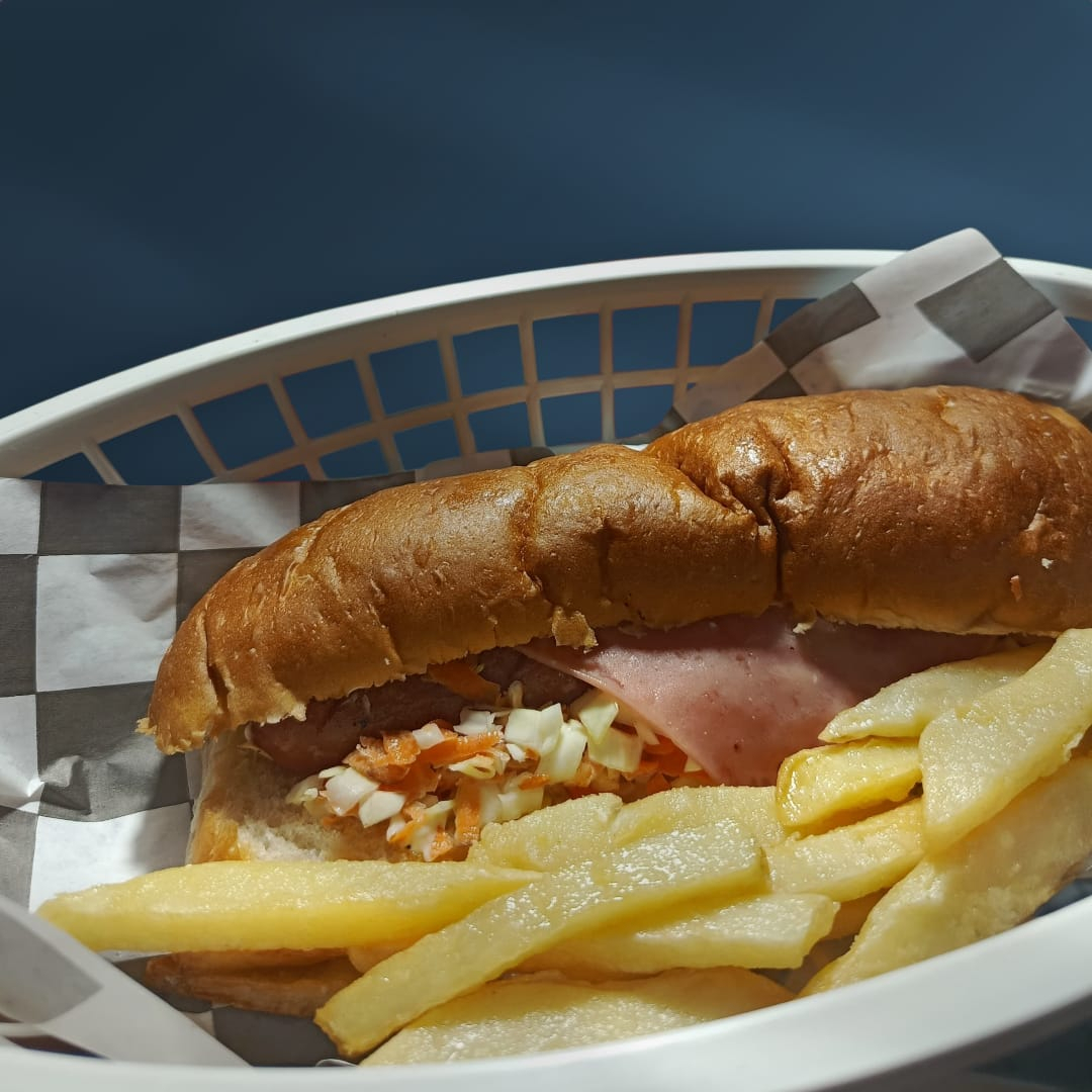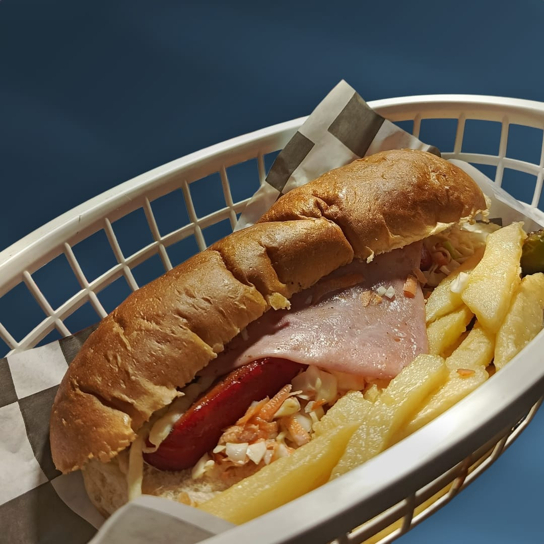 Salchicha de pavo jumbo, jamón, ensalada de col, cebolla, tomate, mayonesa, catsup, mostaza, papas a la francesa y chiles en vinagre o toreados (opcional)