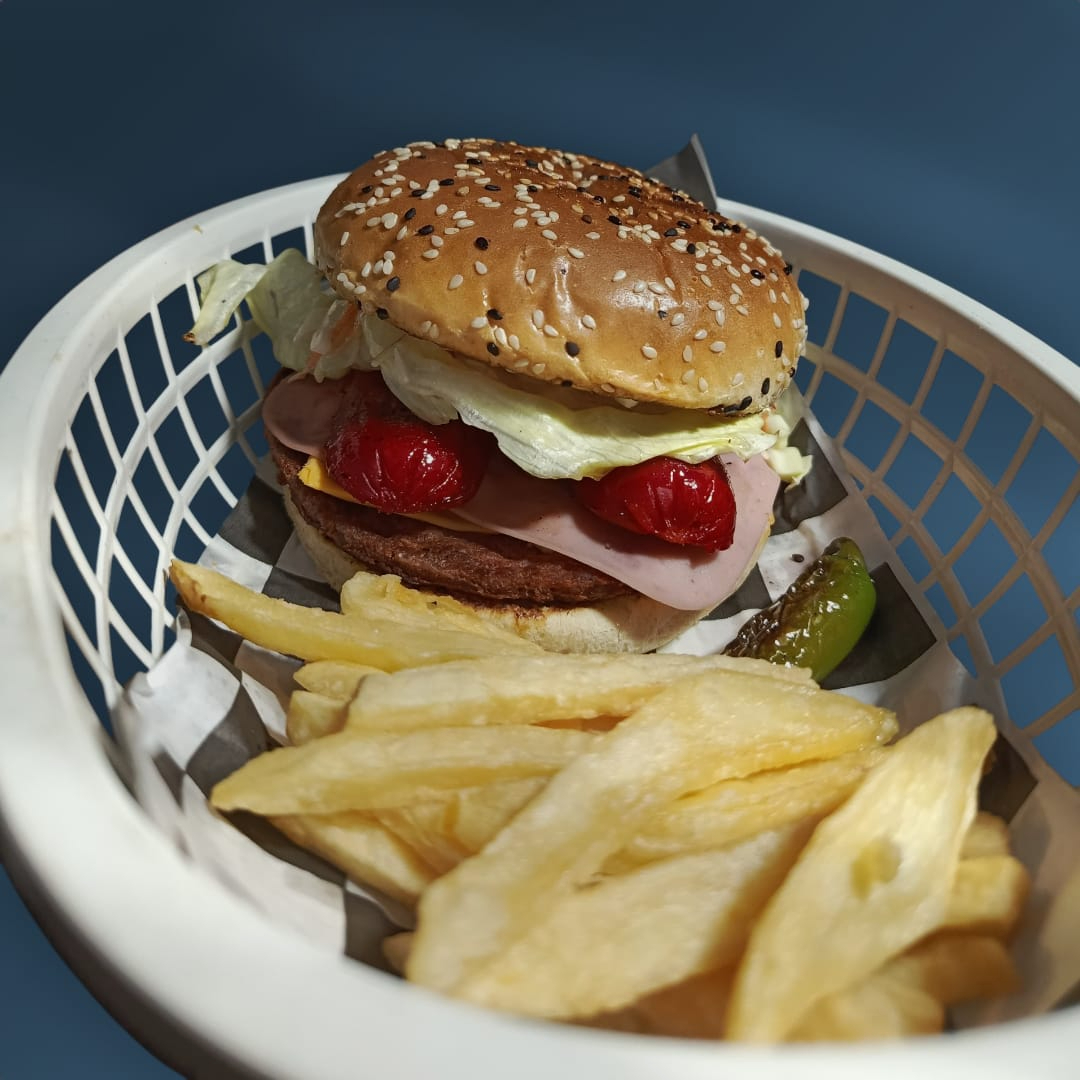 Carne de res, jamón, queso amarillo, lechuga, cebolla, tomate, ensalada de col, mayonesa, catsup y chiles.