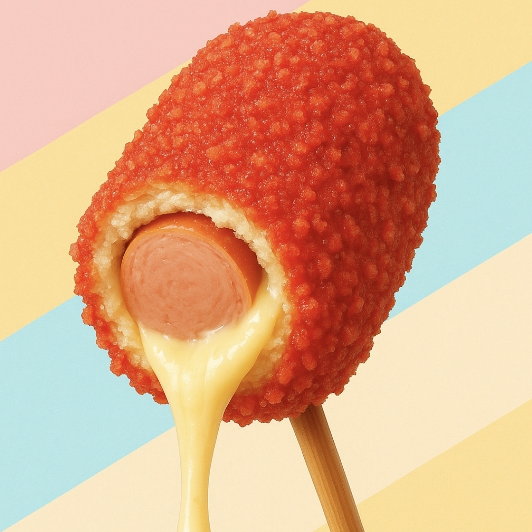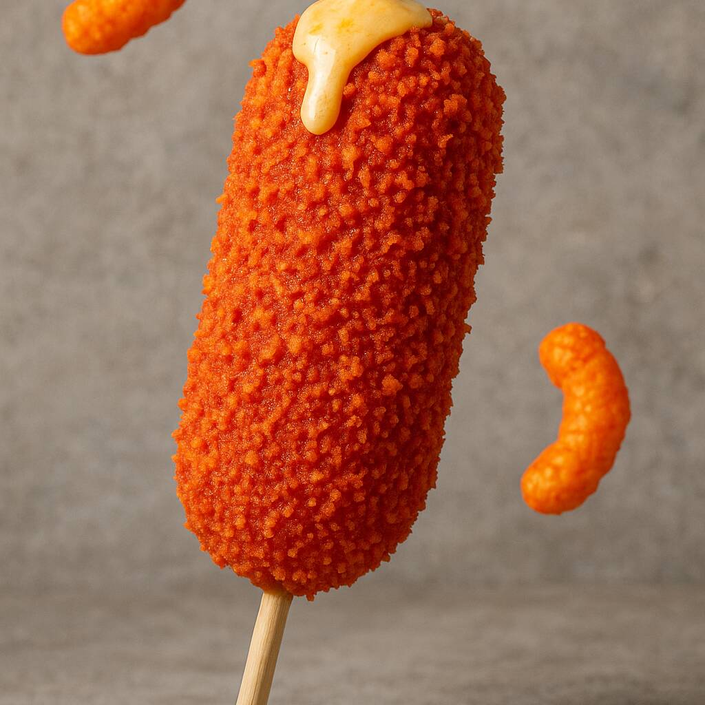 1 banderilla de salchicha de pavo/panko/ cubierta de queso americano y cheetos flamin hot