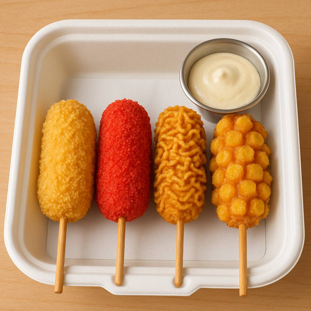 1 banderilla de salchicha, panko y ramen(incluye aderezos)