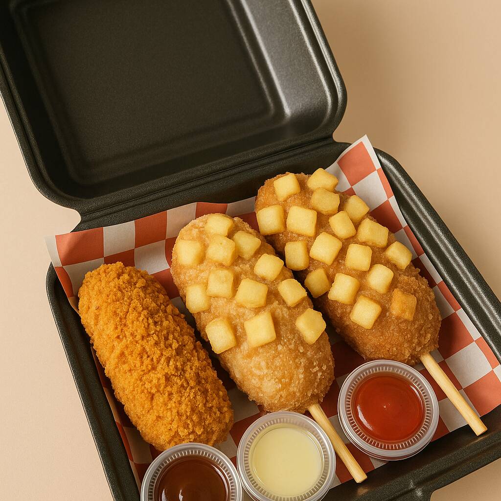 1 banderilla mixta de Salchicha y queso/ panko/ cubierta de queso americano y flamin hot(incluye papas fritass)