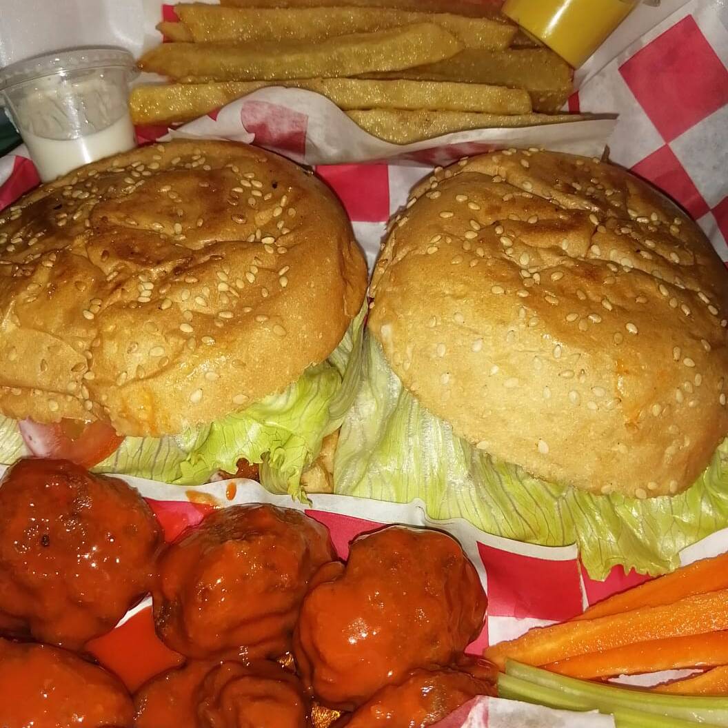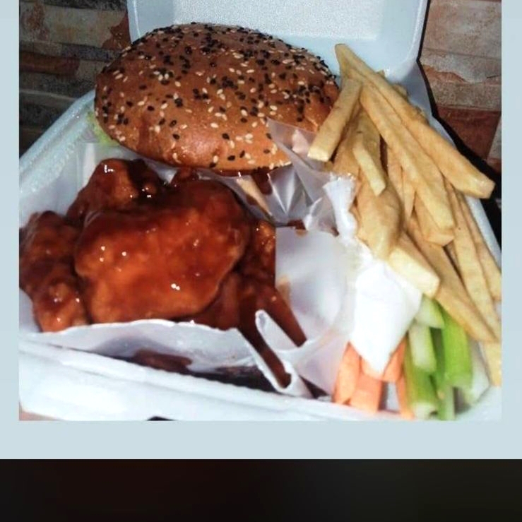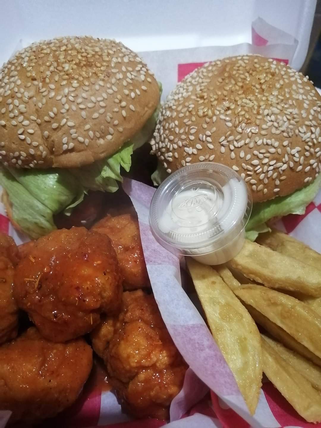 Hamburguesa de boneless, 5 boneless y orden de papas a la francesa.