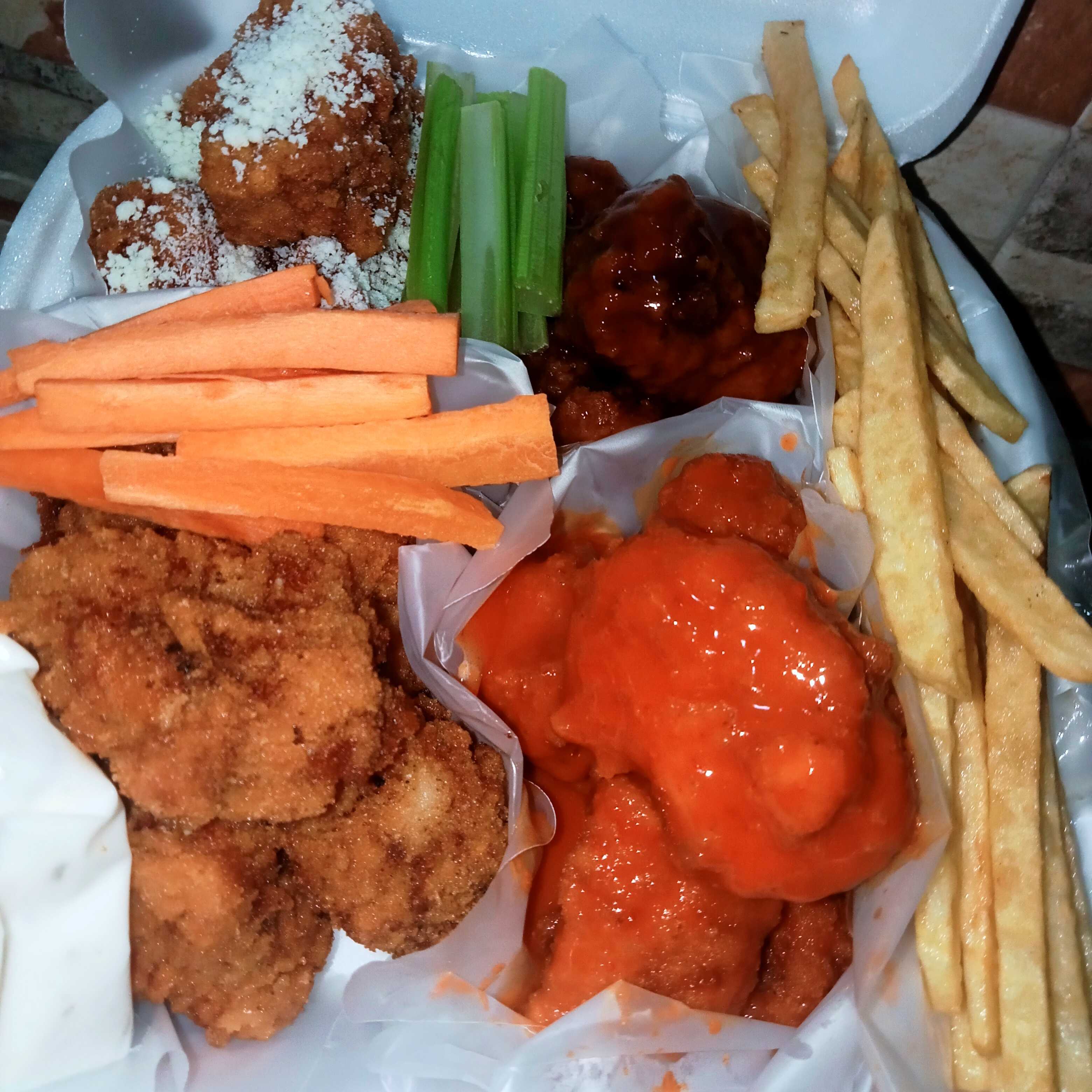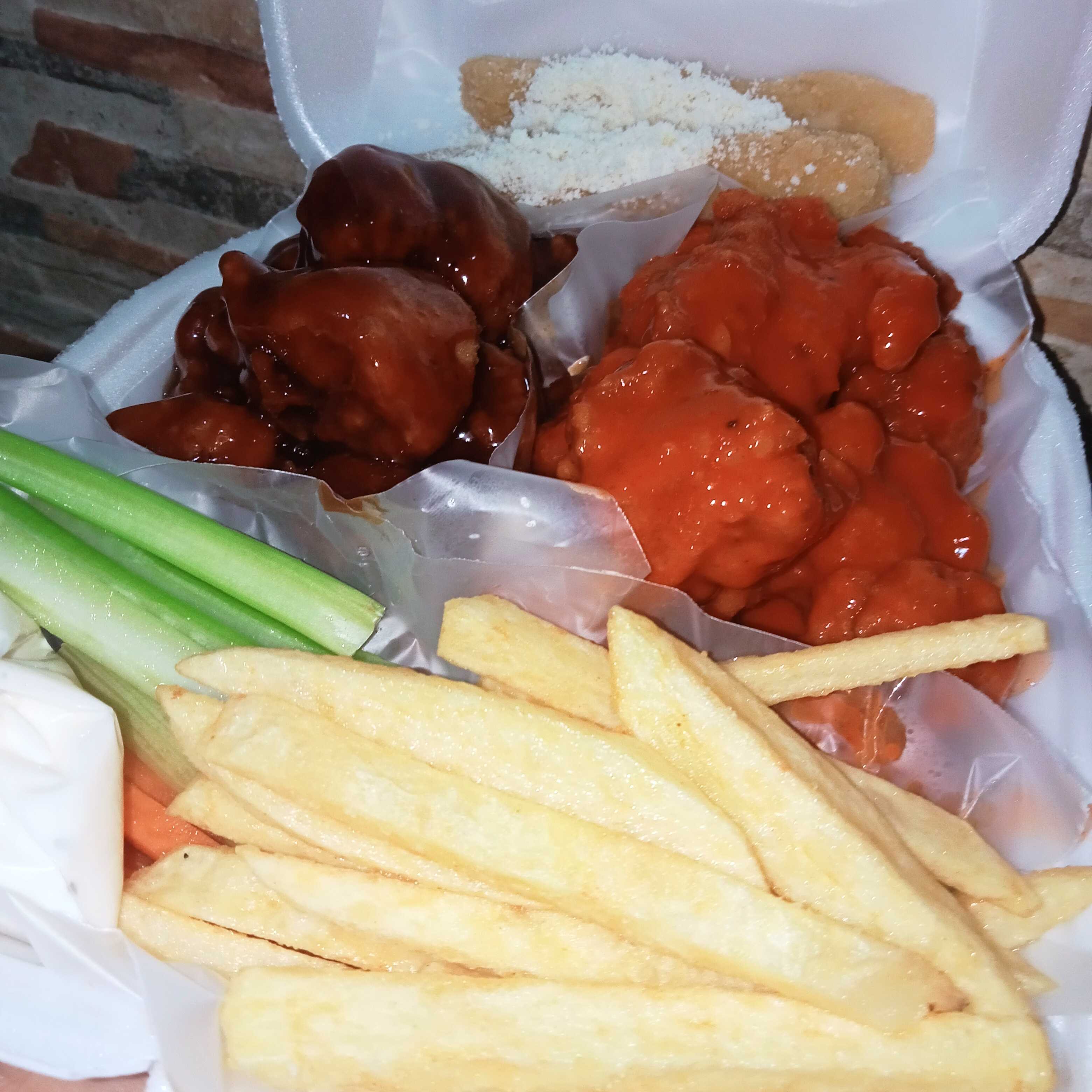 25 Boneless, 2 dedos de queso, orden de papas, zanahoria, apio, ranch, mayonesa y mostaza.