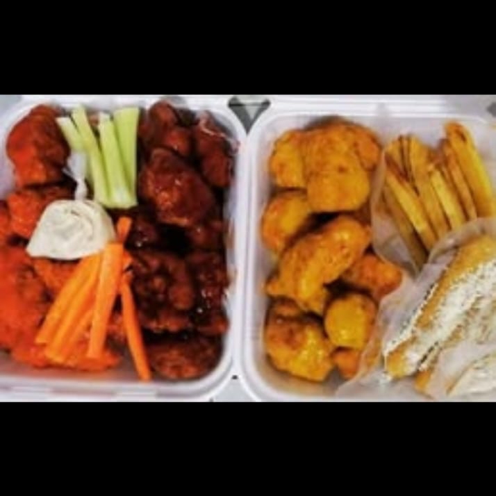 30 Boneless, 2 dedos de queso, orden de papas, zanahoria, apio, ranch, mayonesa y mostaza.