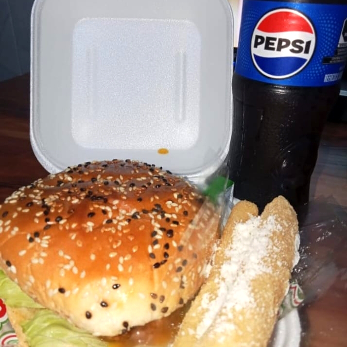 1 Hamburguesa, 2 dedos de queso y 1 refresco Pepsi 600 ml.