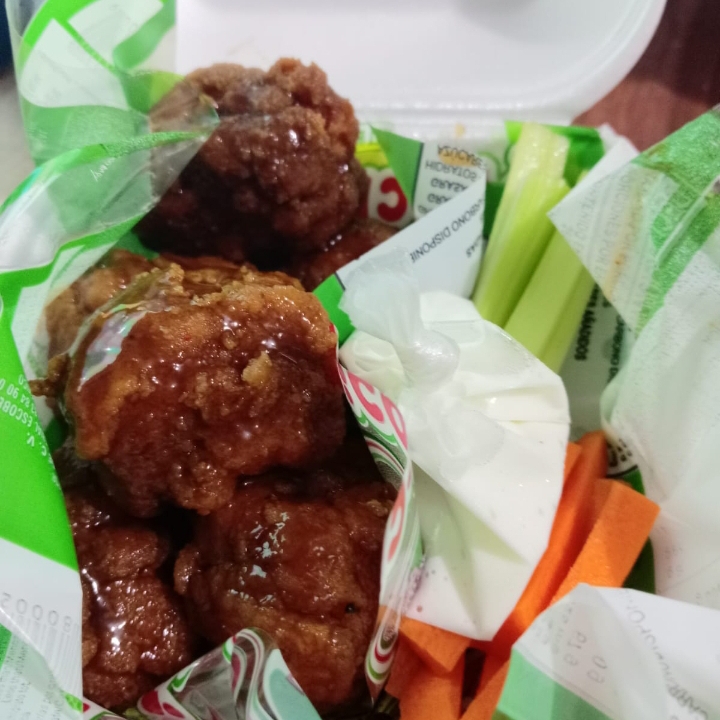 12 Boneless, porción de papas, zanahoria, apio, ranch, mayonesa y mostaza.