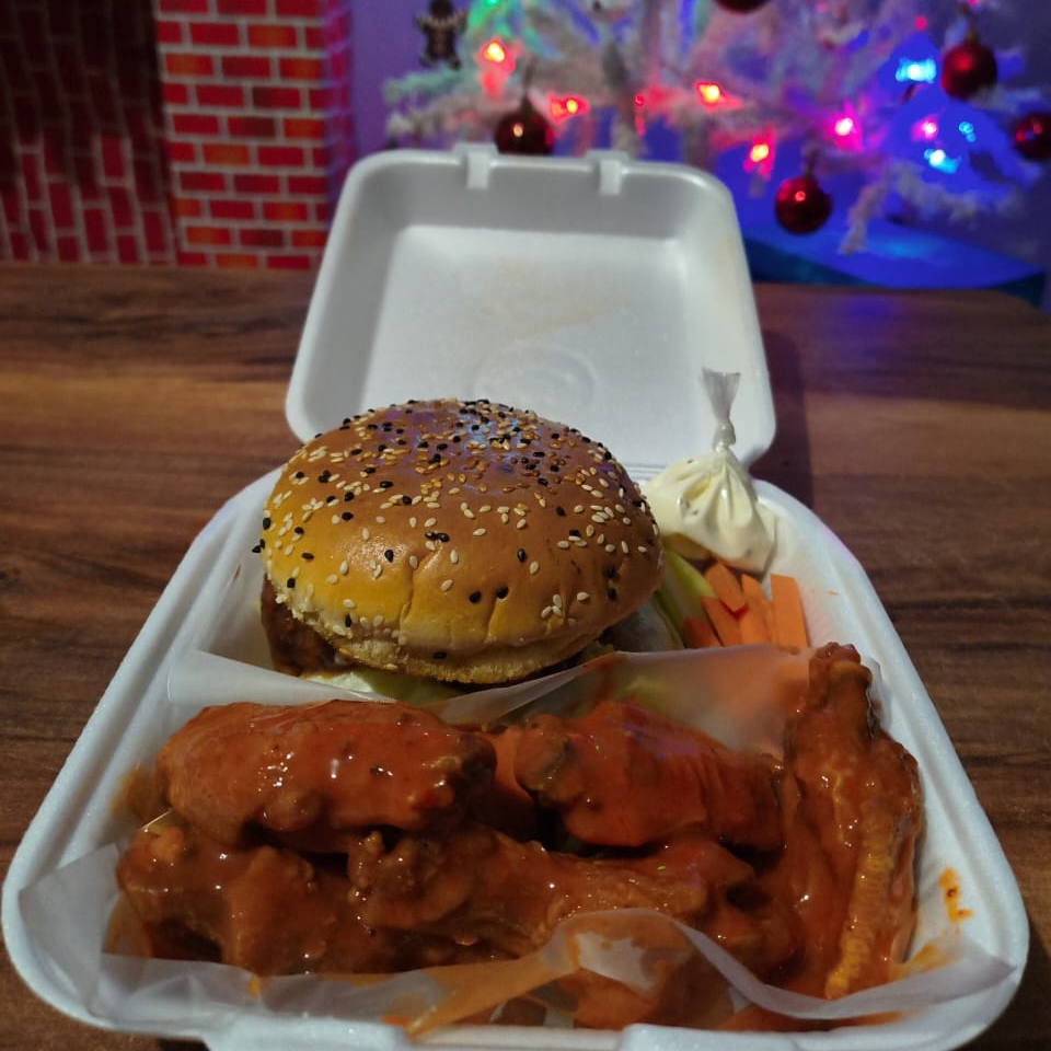 2 Hamburguesas, 5 boneless, zanahoria, apio, ranch, mayonesa y mostaza.