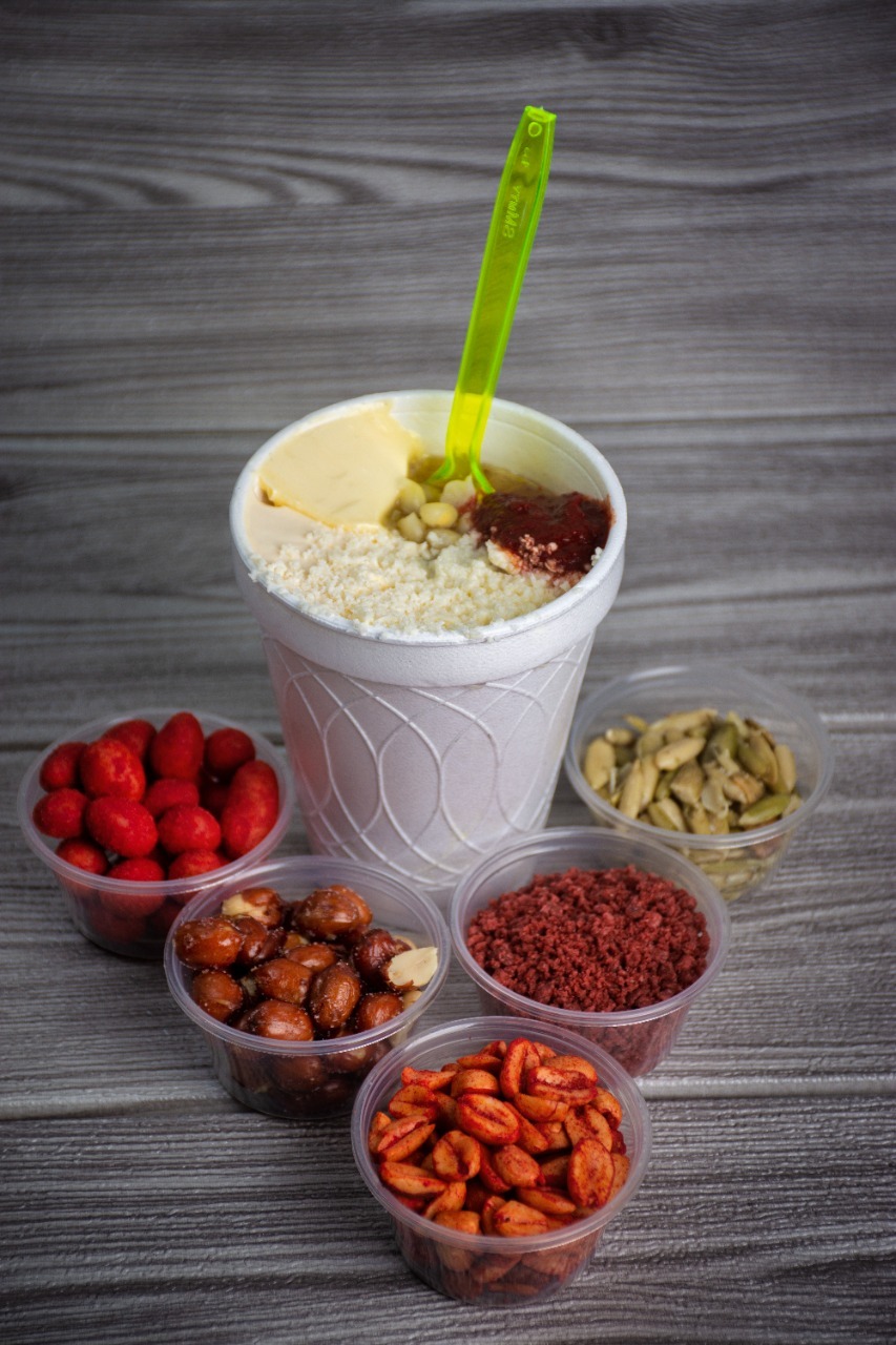 Limón, sal, mayonesa, queso y salsa de cacahuate