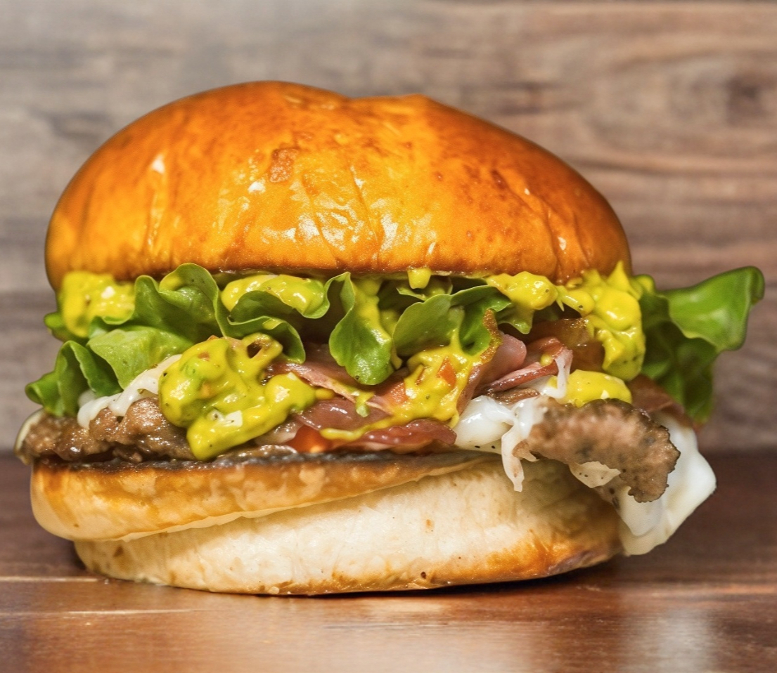 Pan de la casa con jugosa carne 100% de res, pico de gallo con guacamole, lechuga, tomate y aderezos.