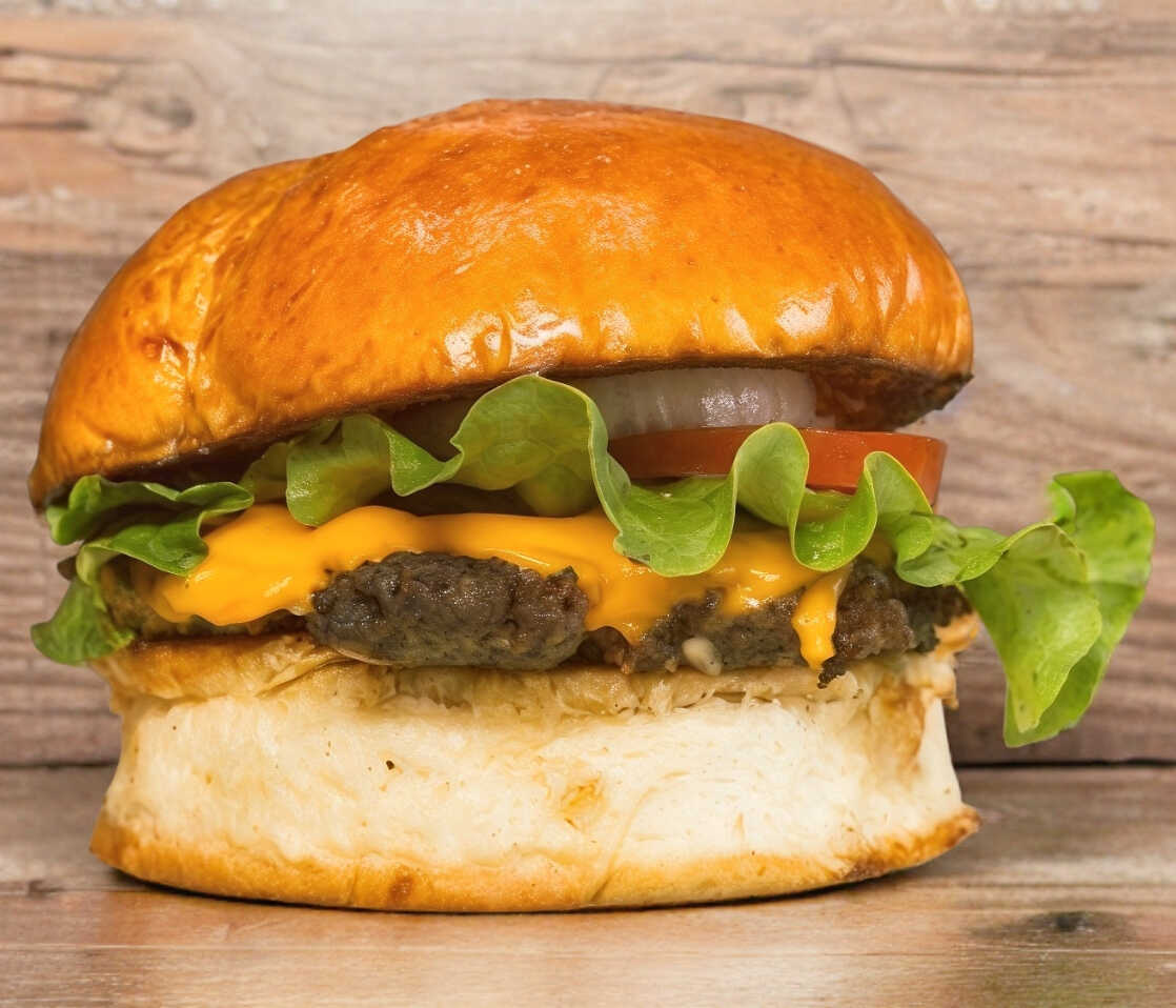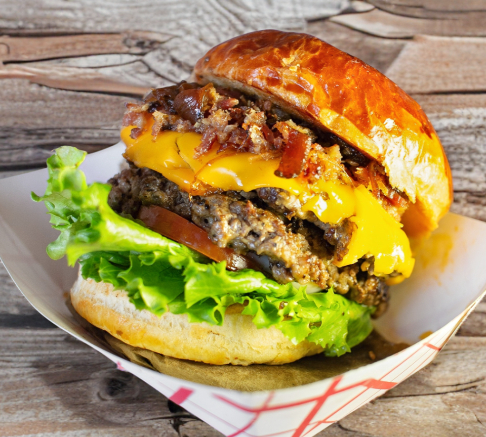 Pan de la casa con jugosa carne 100% de res, doble porción de queso americano, trozos de tocino, cebolla caramelizada, lechuga, tomate, cebolla y aderezos.