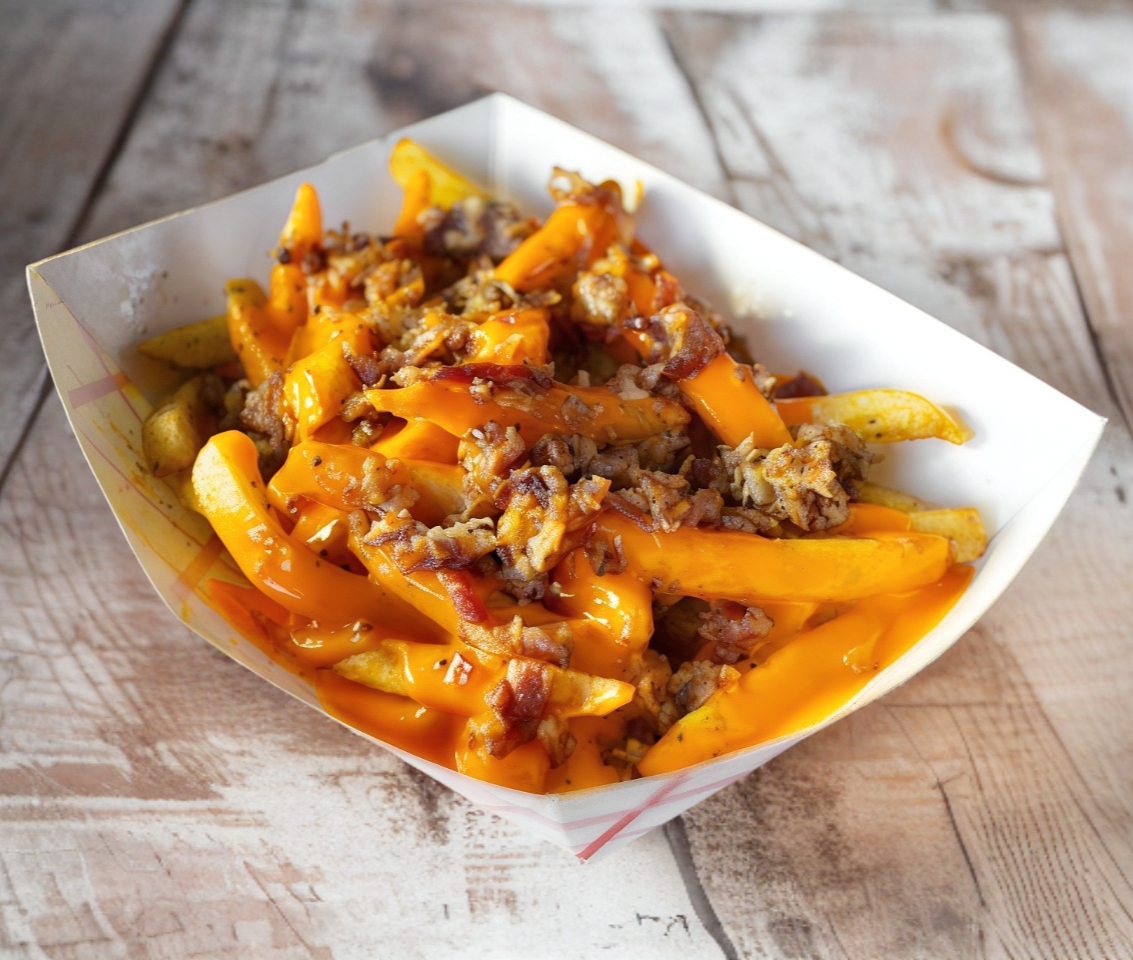 170 gr de Deliciosas papas a la francesa, queso derretido, tocino picado y aderezos.