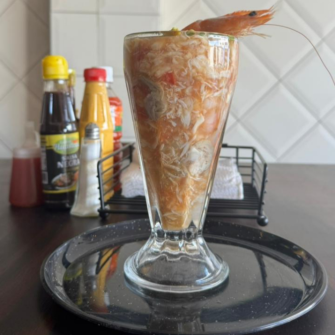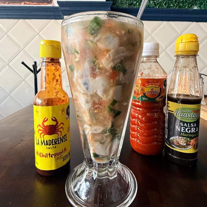 Pescado de trucha, camarón, calamar, pulpa de jaiba, ostión, tomate, cebolla, cilantro, aguacate y preparado de salsas