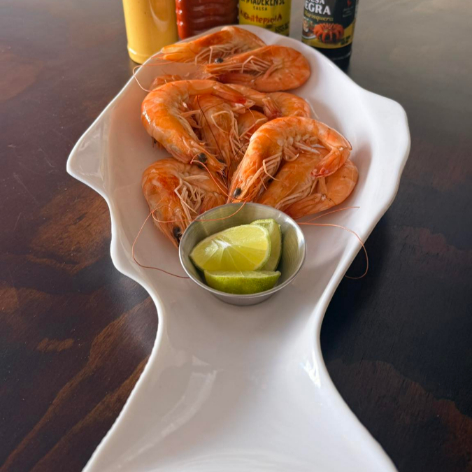 Pescado de trucha, camarón, tomate, cebolla, cilantro y aguacate