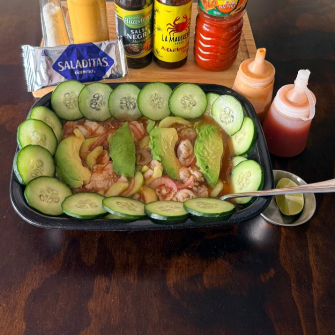 Camarón curtido con limón, salsa de chile de árbol y chile piquín, pepino y cebolla morada