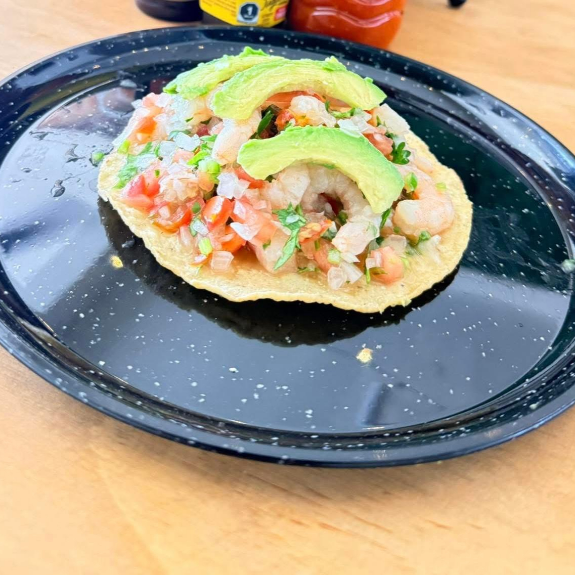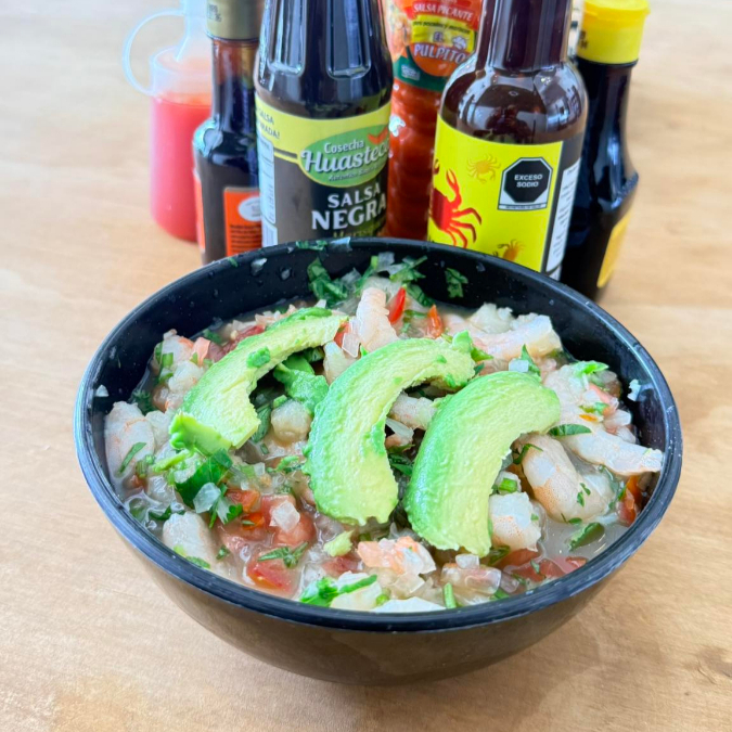 Camarón, tomate, cebolla, cilantro, aguacate y preparado de salsas