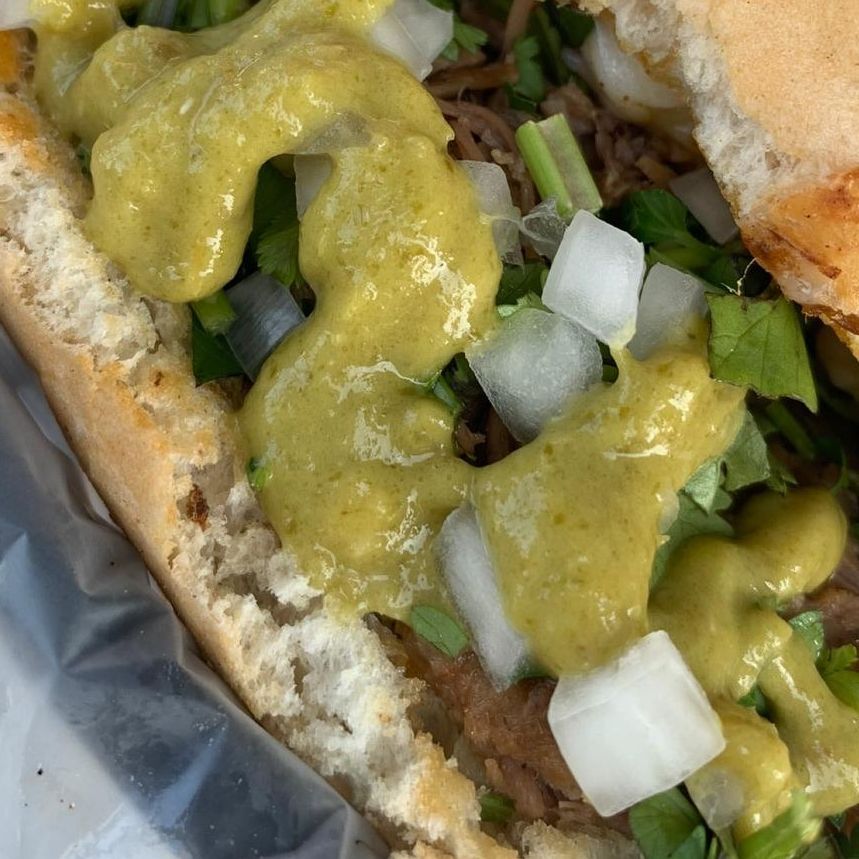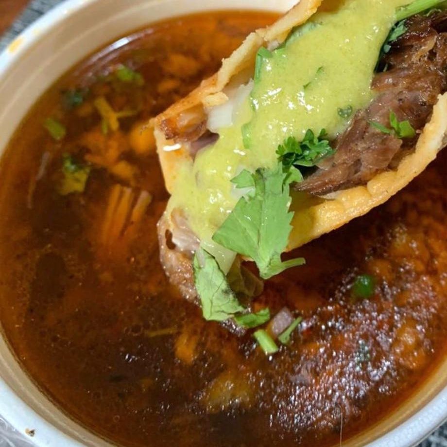 Tortilla Doradita con abundante y jugosa birria. Salsa, Limon, Cilantro y Cebolla( se envia todo x separado )