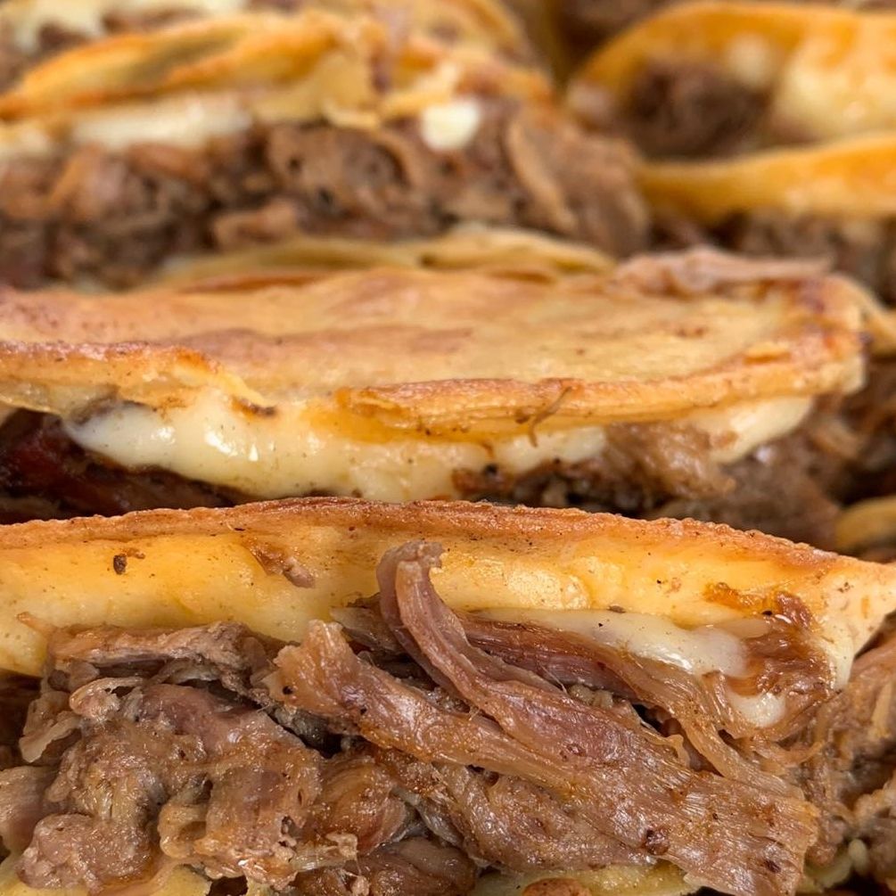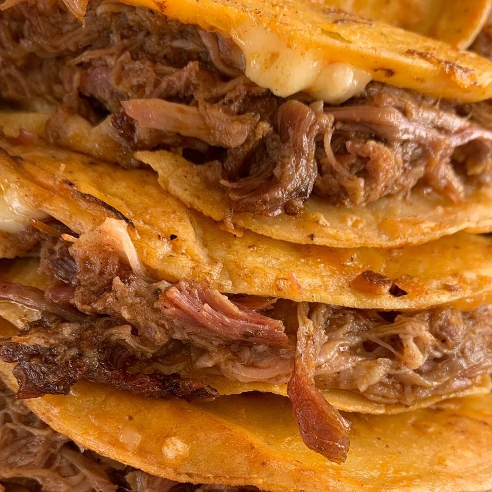 Tortilla Doradita con abundante queso y jugosa birria. Salsa, Limon, Cilantro y Cebolla( se envia todo x separado )