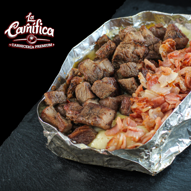 Carne asada, pimientos, cebolla, tocino y queso.