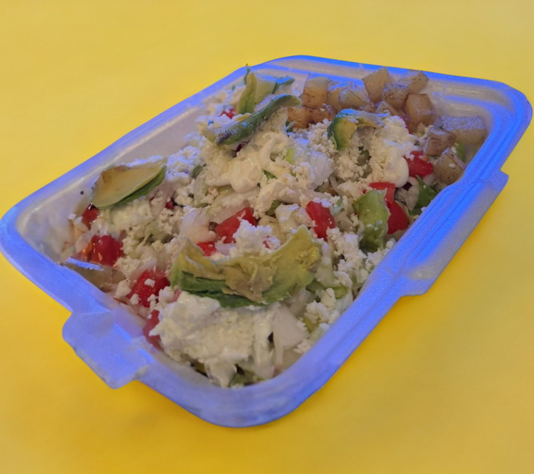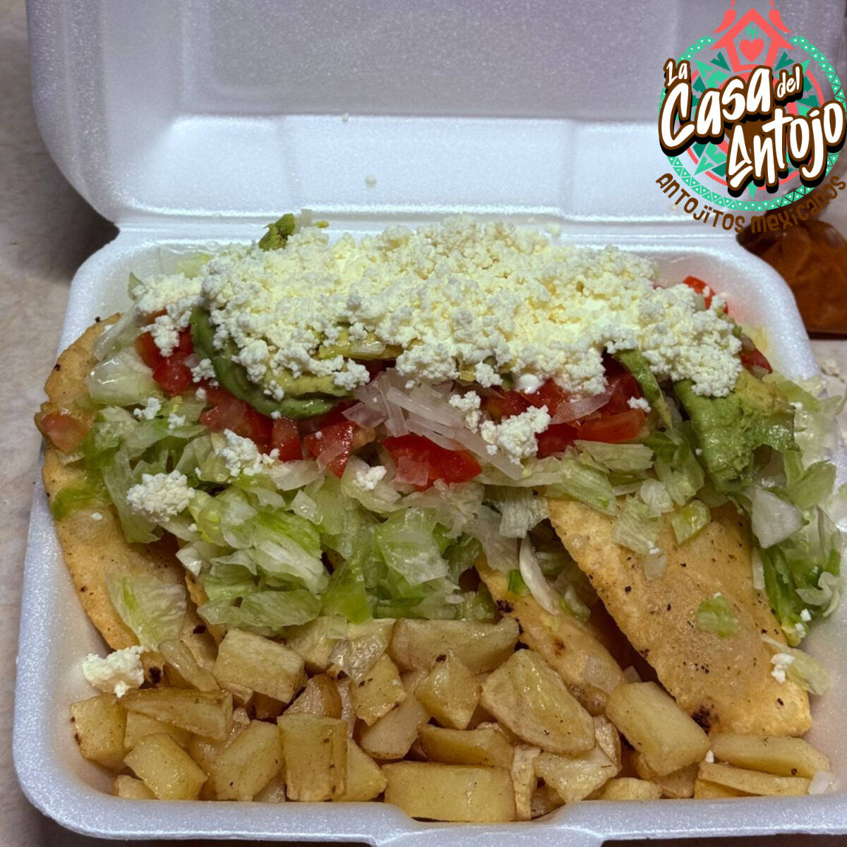 Orden de 5 quesadillas fritas rellenas de queso asadero. Lechuga, tomate, cebolla, queso, crema y aguacate.