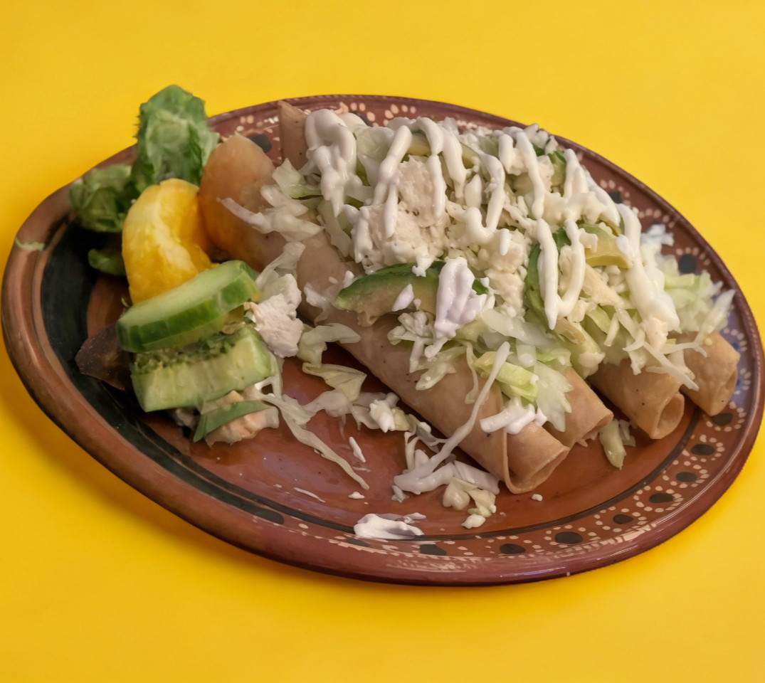 Orden de 4 flautas papa, frijol o mixtos con carne deshebrada. Lechuga, tomate, cebolla, queso, crema y aguacate.