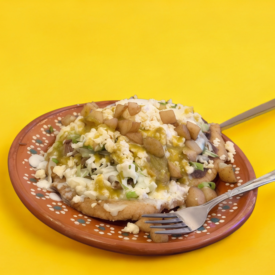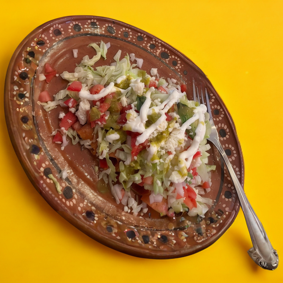 Migada grande base de papa, frijol o mixtos con carne deshebrada. Lechuga, tomate, cebolla, queso, crema y aguacate.