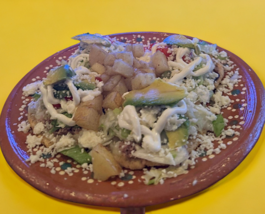 Orden de 5 sopes base de papa, frijol o mixtos con carne deshebrada. Lechuga, tomate, cebolla, queso, crema y aguacate.