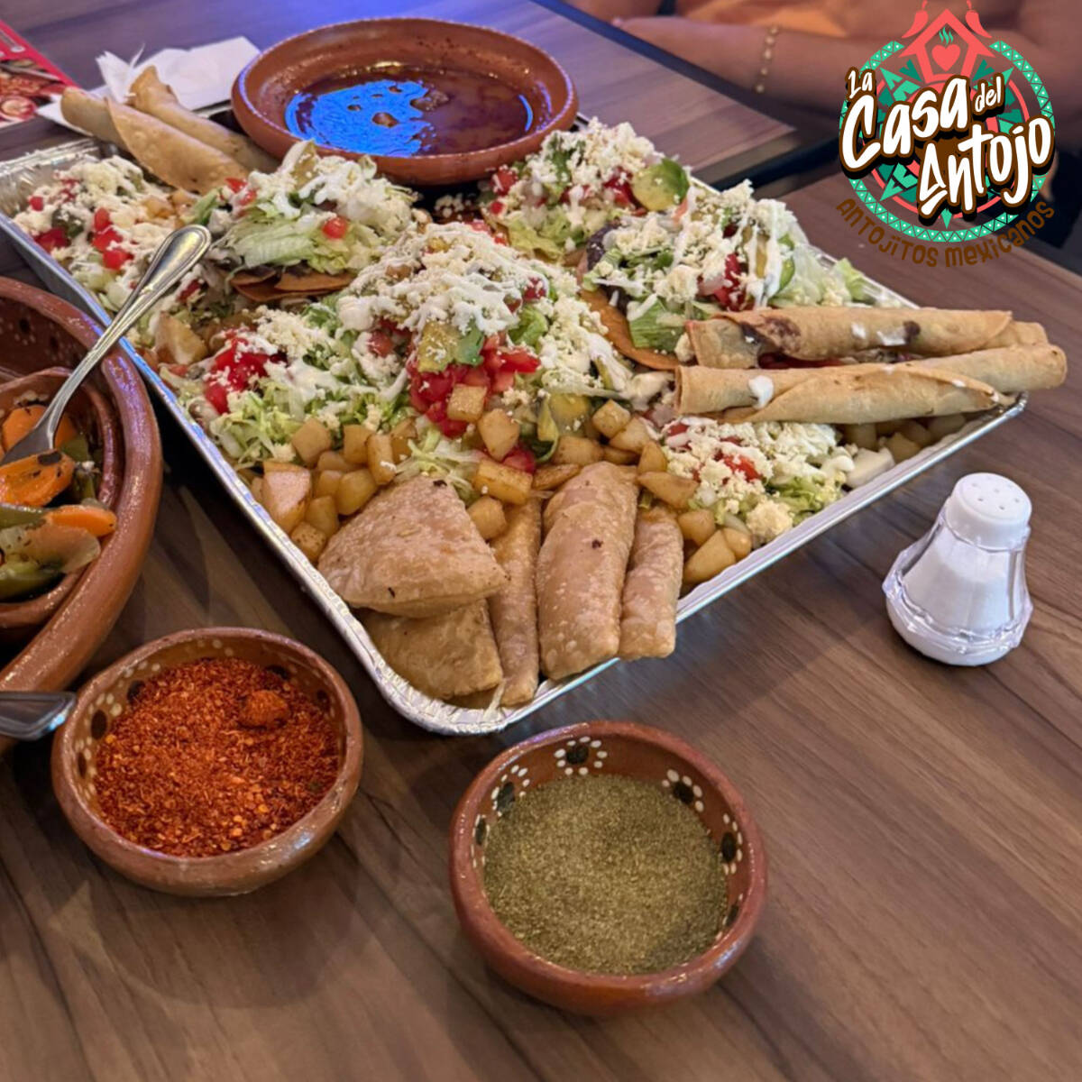 CHAROLA PARA 8-10 PERSONAS incluye: 5 blanditos, 8 sopes, 5 quesadillas, 3 tostadas, 4 flautas, 1 lto de pozole y 2 postres a elegir