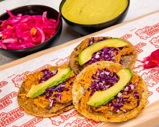 Gordita frita con guiso de cochinita pibil, lechug, tomate, cebollita morada, aguacate
