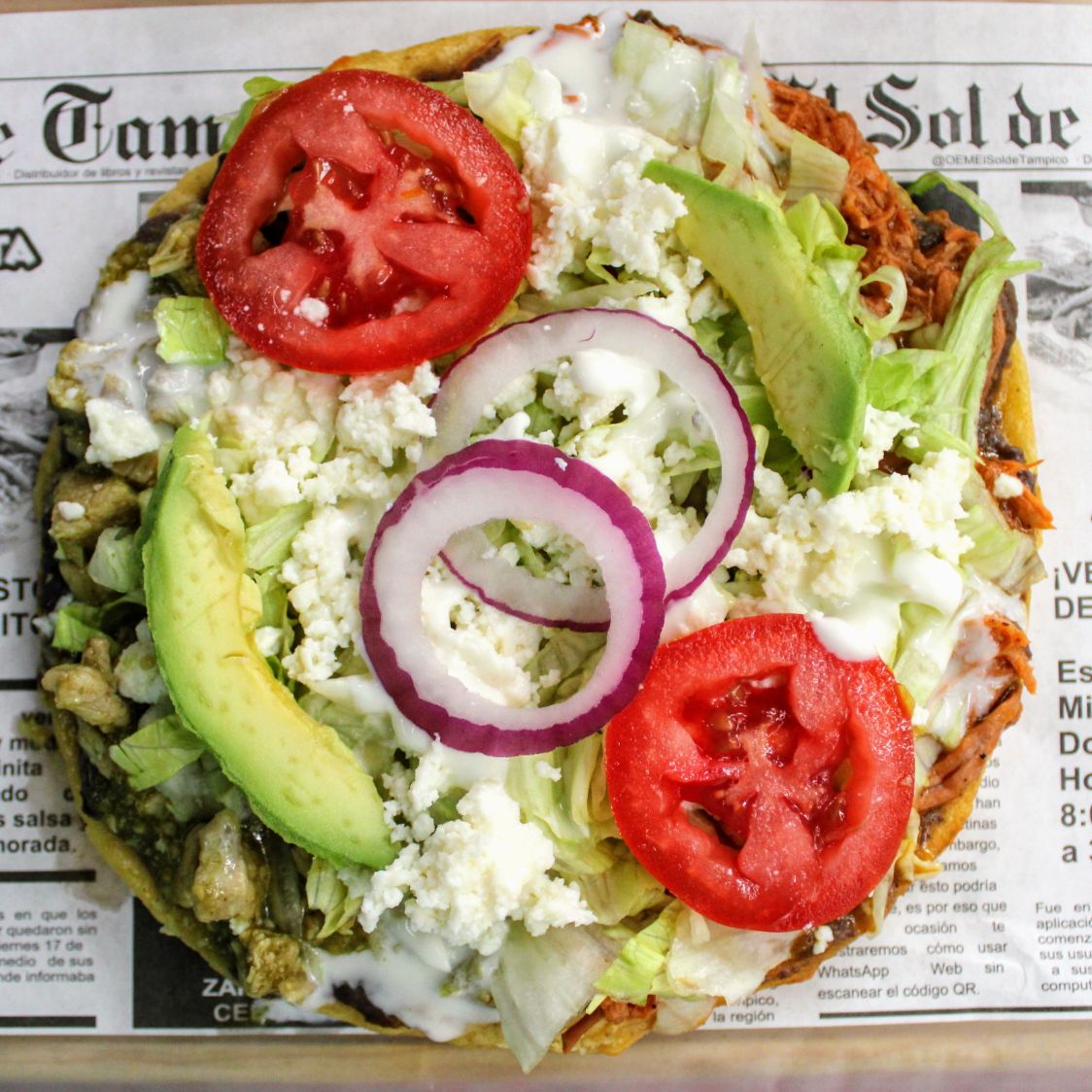 Tortilla gruesa y grande con frijolitos ,uno o dos guisos, lechuga, tomate queso molido, crema, cebolla.