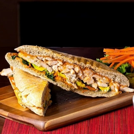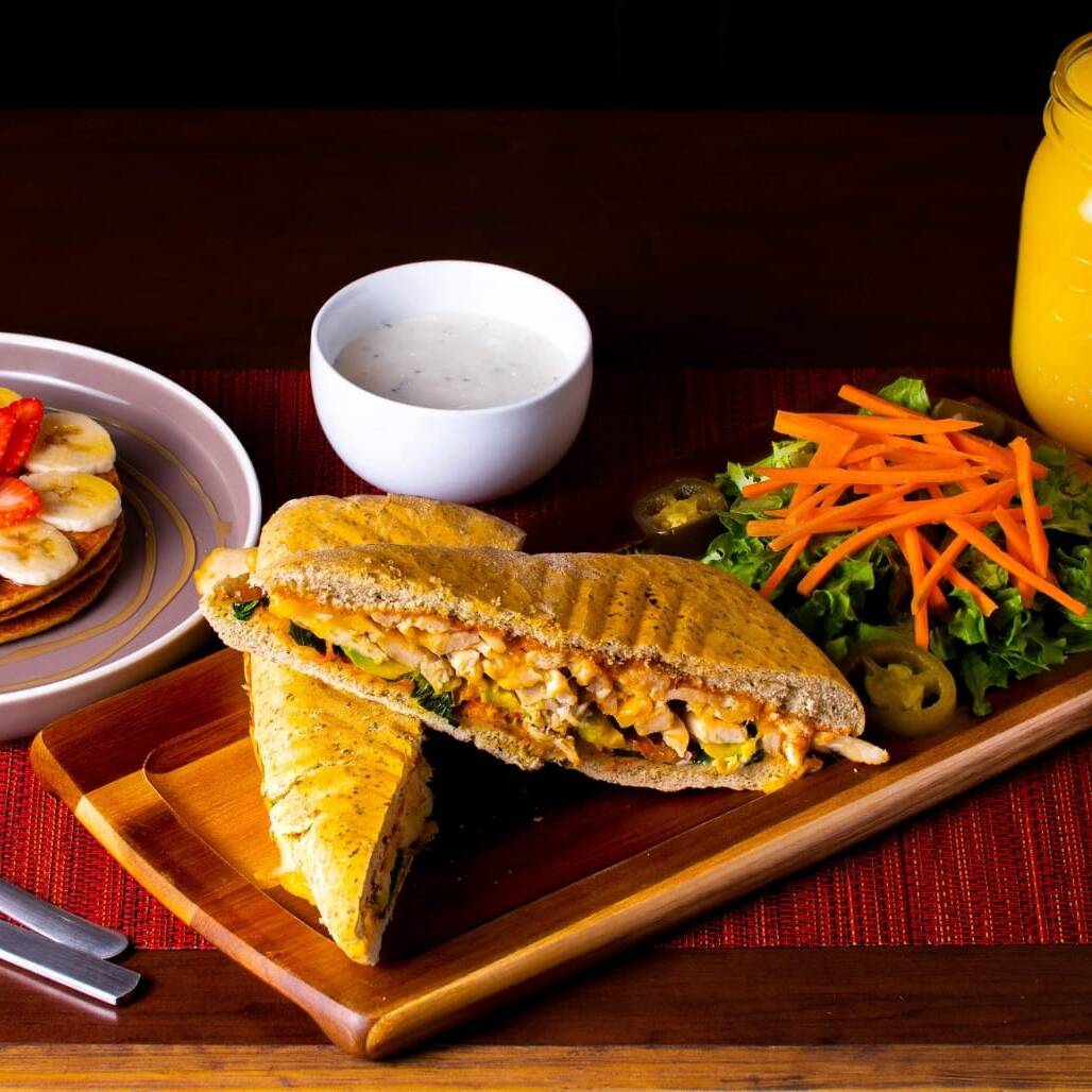 Panini de finas hierbas con pechuga de pollo a la plancha, aguacate, espinacas, tomate, aderezo chipotle y queso gouda o panela, acompañado de una pequeña ensalada y aderezo ranch.