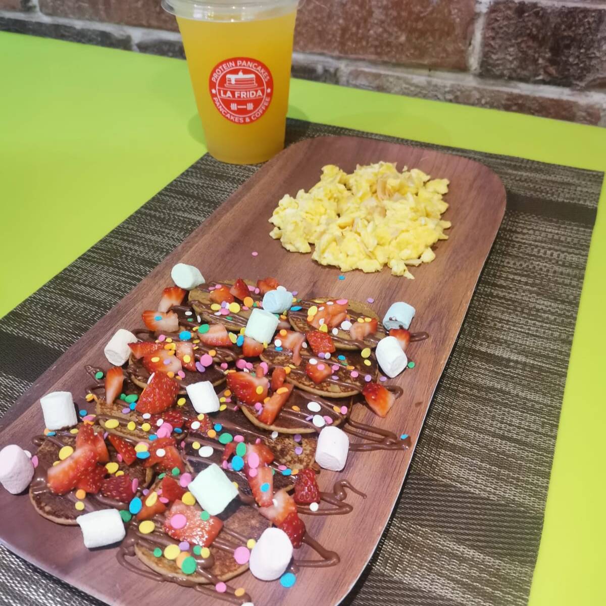 8 Mini pancakes con fresa, plátano, Nutella y confitería, acompañado de 2 huevos revueltos con pechuga de pavo. Incluye una bebida.
