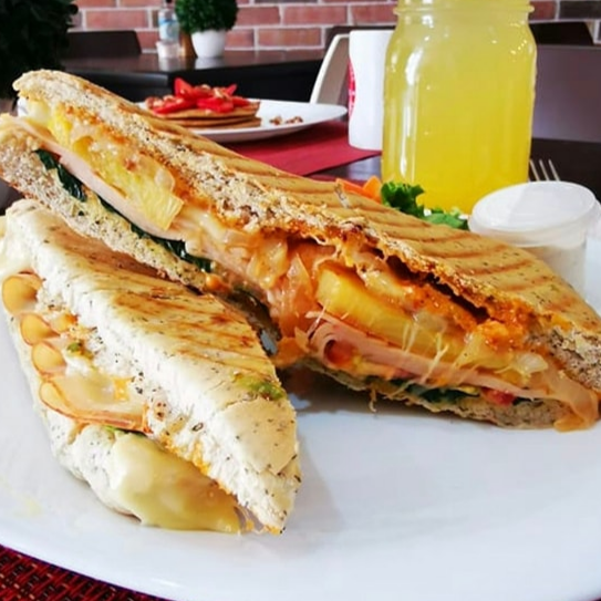 Panini de finas hierbas con jamón de pechuga de pavo, queso gouda, piña a la plancha, aderezo chipotle, cebolla caramelizada, espinacas y tomate, acompañado de una pequeña ensalada con aderezo ranch.