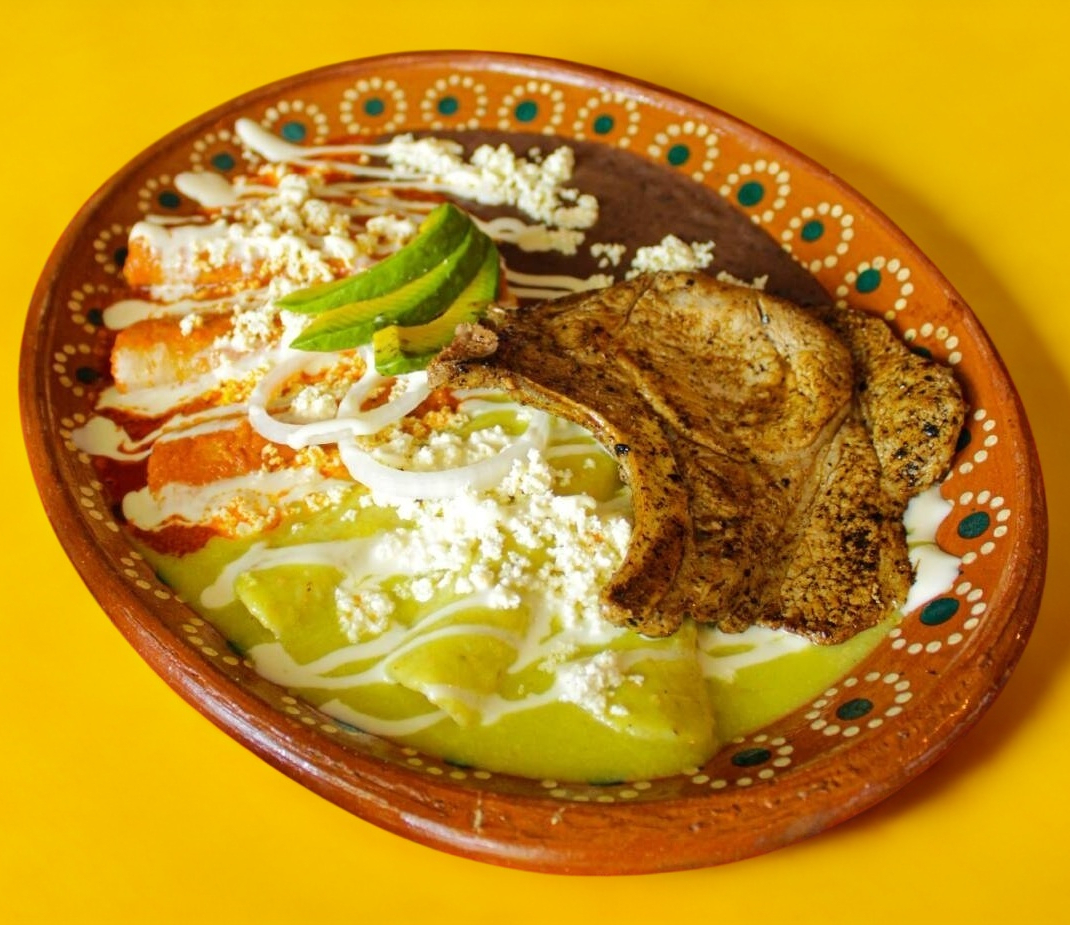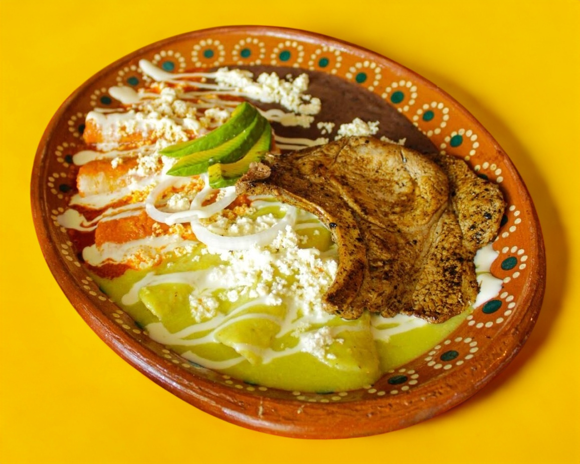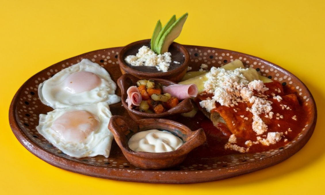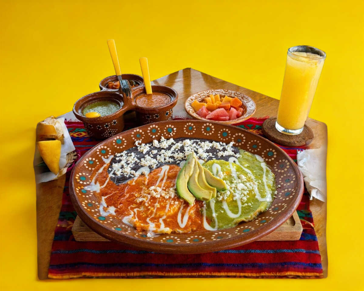 2 Enchiladas Rojas y 2 Enchiladas Verdes (tú eliges el nivel de picor), acompañados de un Par de Huevos Estrellados, 2 rollos de jamón, mezcla de papa con zanahoria al tomillo, acompañado de frijoles refritos, queso fresco, crema de rancho, tomate, cebolla y aguacate.