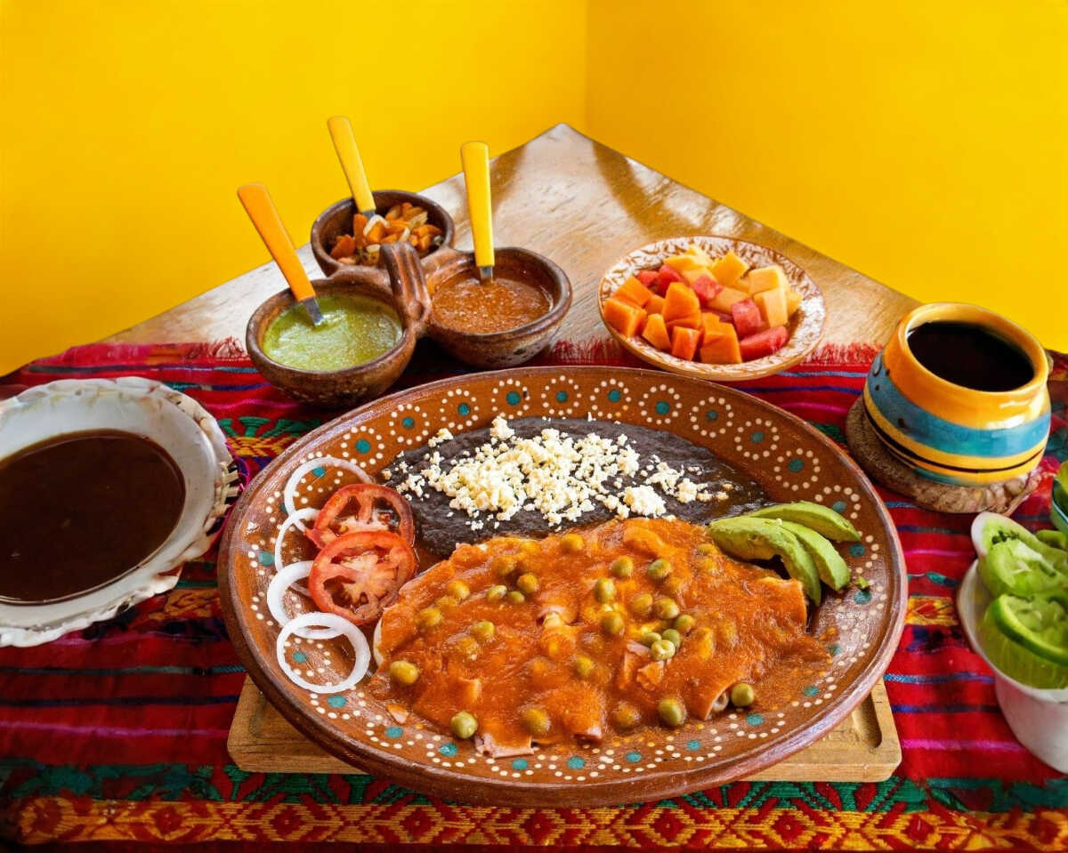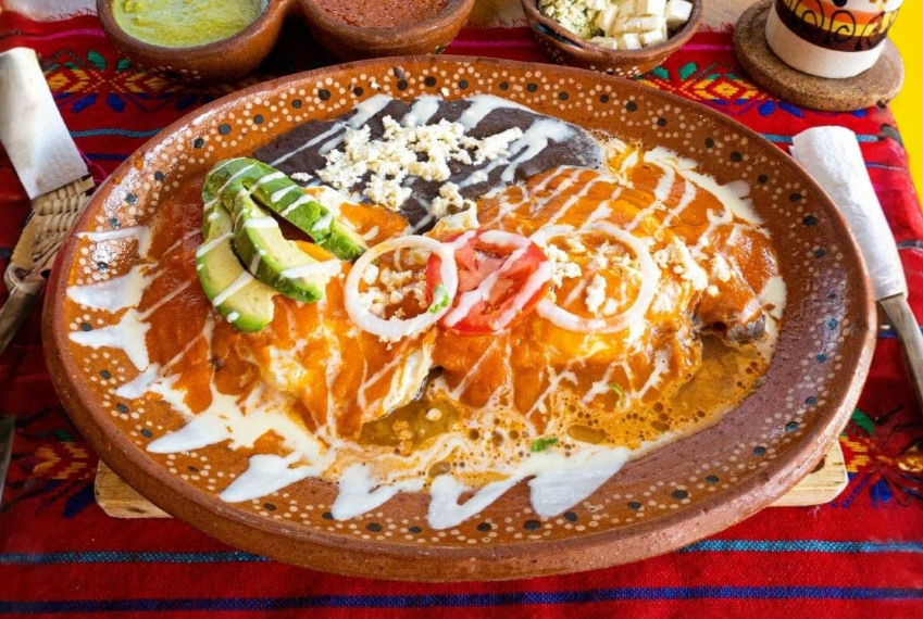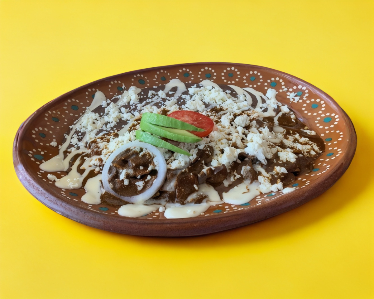 Bañados en Mole, acompañado de frijoles refritos, queso fresco, crema de rancho, tomate, cebolla y aguacate.