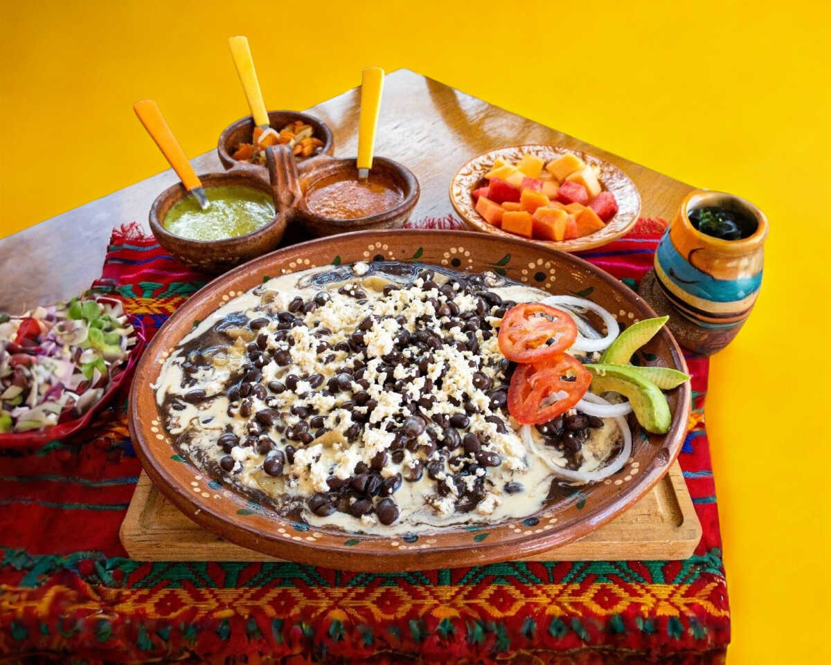 Tortilla grande de comal, partida en pedacitos, bañada de frijoles de olla, acompañada de queso fresco, crema de rancho, tomate, cebolla y aguacate.