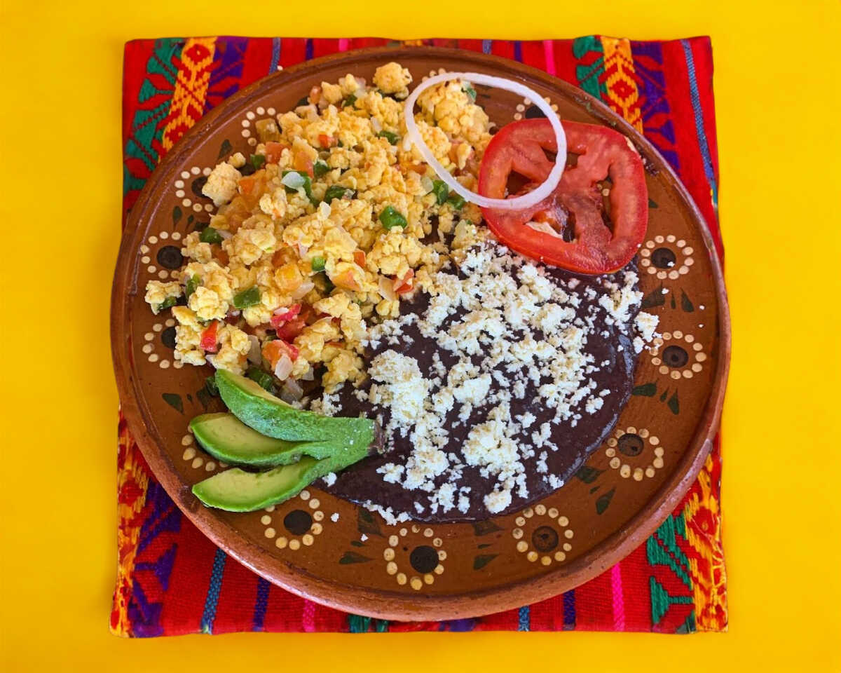 Par de Huevos Revueltos, acompañados de frijoles refritos, queso fresco, crema de rancho, cebolla, tomate, aguacate y tortillas de comal.