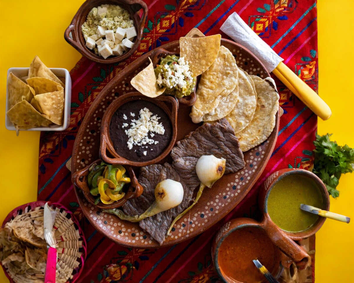 Orden con 5, guisos a elegir, acompañados de una suave tira de cecina, frijoles refritos, queso fresco, tomate, cebolla y aguacate.
