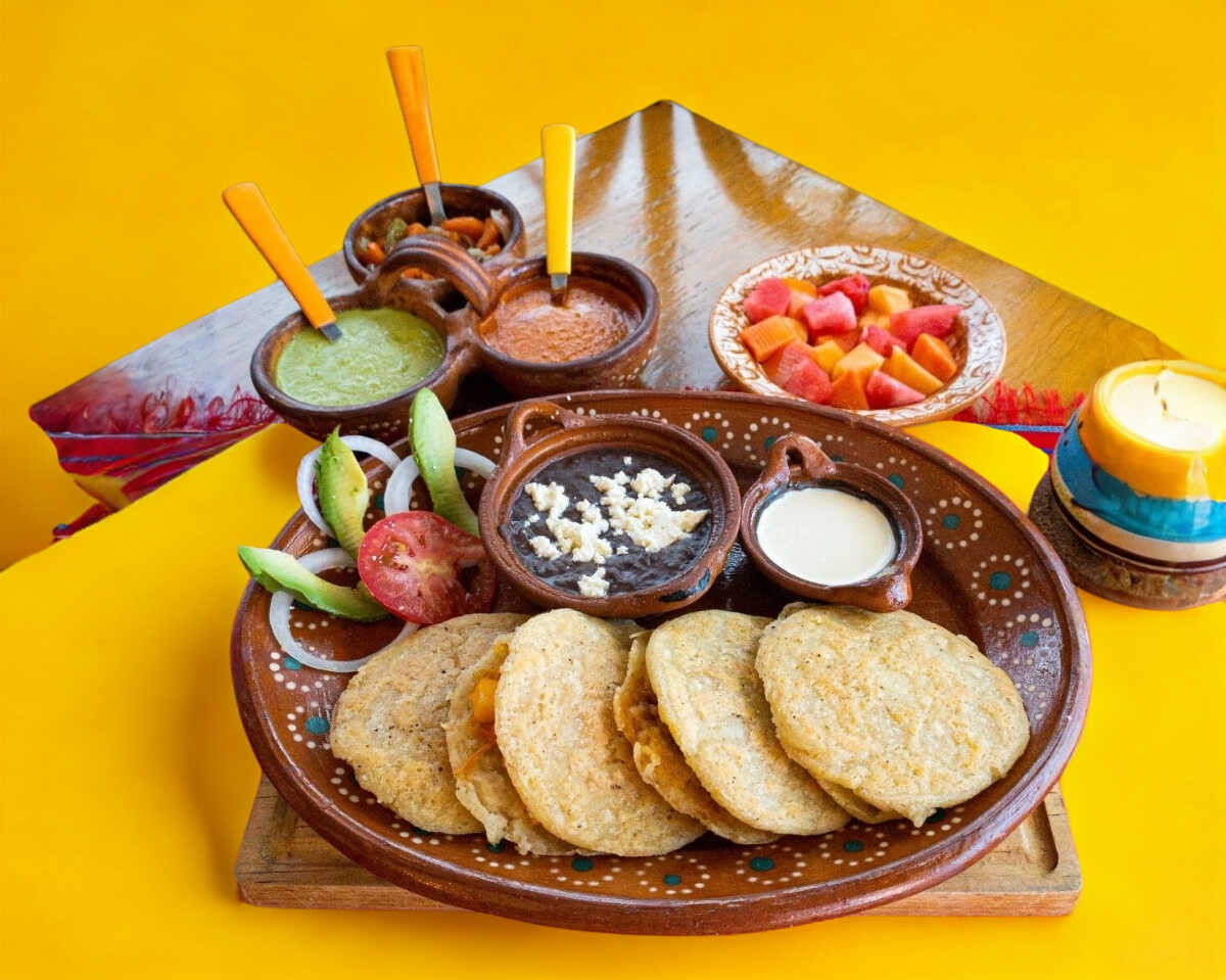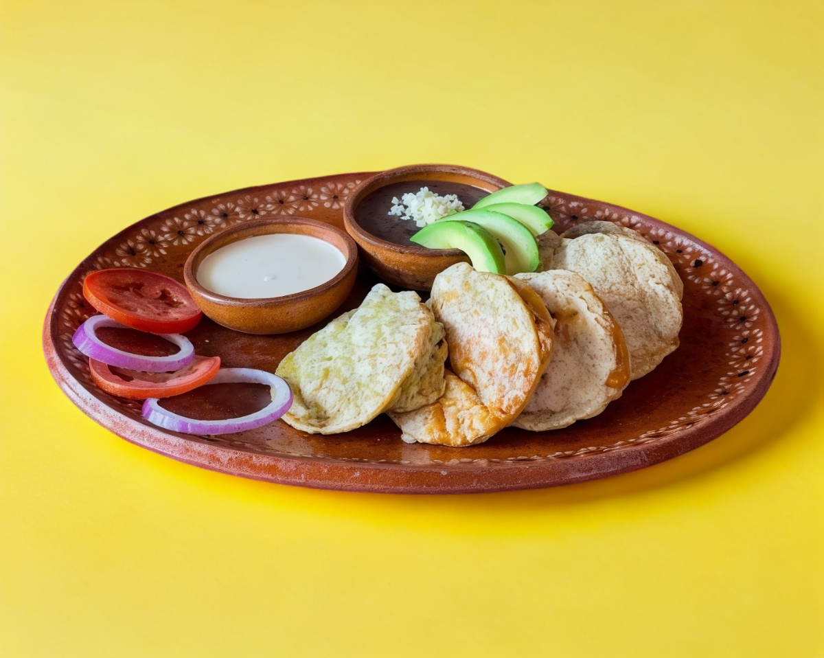 Orden con 5, rellenas de guisos a elegir, acompañadas de frijoles refritos, queso fresco, crema de rancho, tomate, cebolla y aguacate.