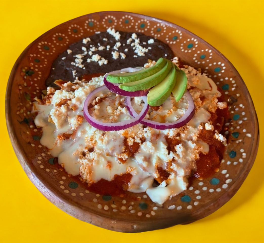 Chilaquiles Rojos Bañados en Salsa Roja, acompañado totopos de maiz y de frijoles refritos, queso fresco, crema de rancho, tomate, cebolla y aguacate.