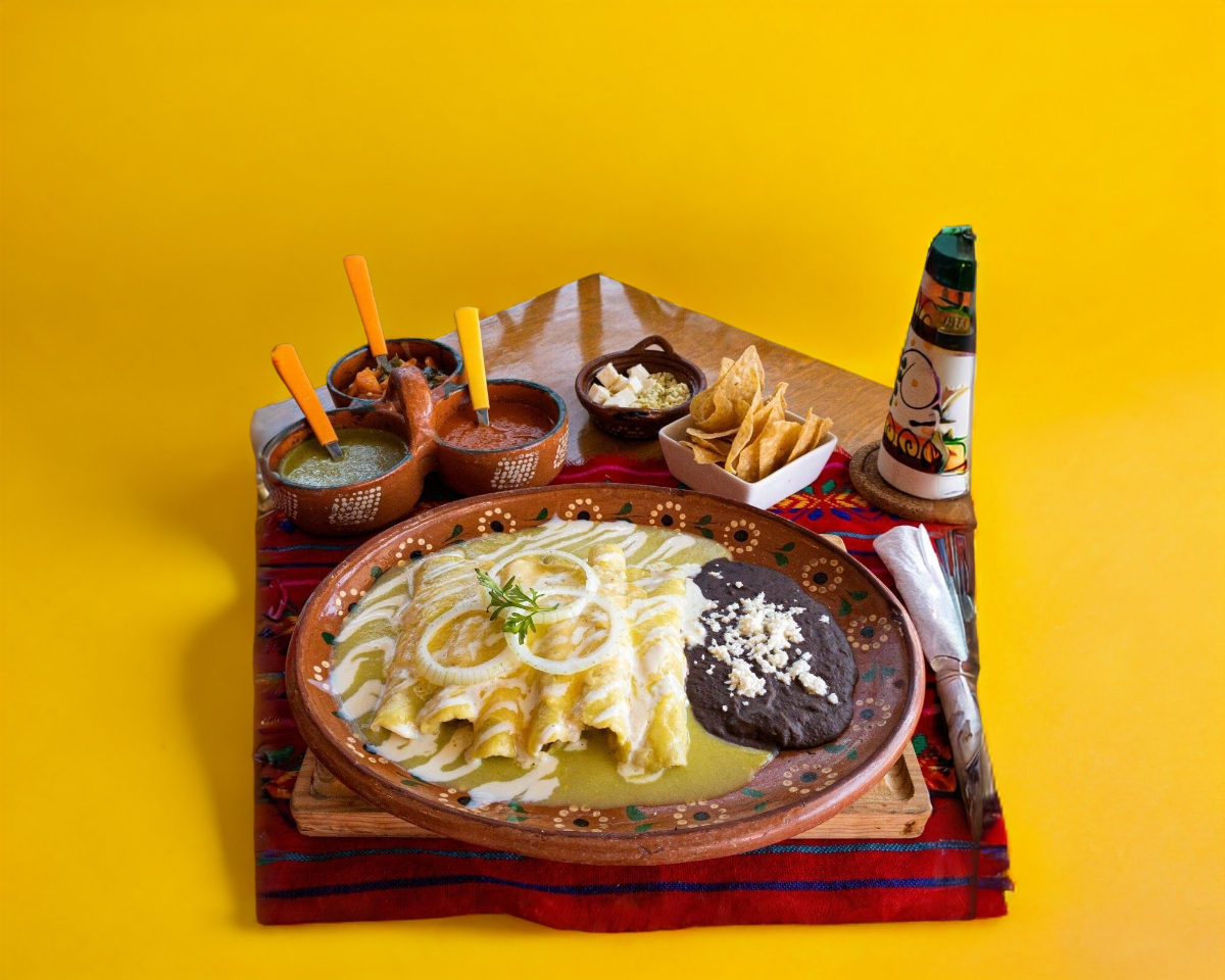 Bañados en Salsa Verde, acompañado de frijoles refritos, queso fresco, crema de rancho, tomate, cebolla y aguacate.