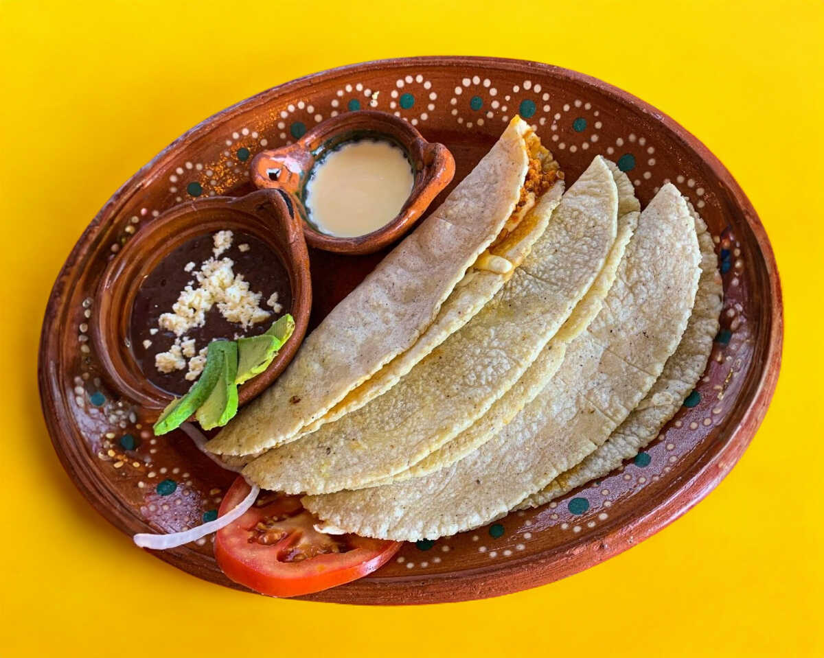 Orden con 4 elaboradas en masa azul, rellenas de chicharrón de cachete y queso menona, acompañado de frijoles refritos, crema de rancho y un encurtido de zanahoria con repollo.