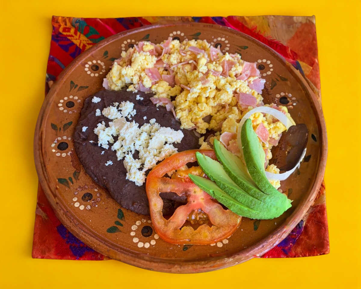 Par de Huevos Revueltos con jamón, acompañados de frijoles refritos, queso fresco, crema de rancho, cebolla, tomate, aguacate y tortillas de comal.