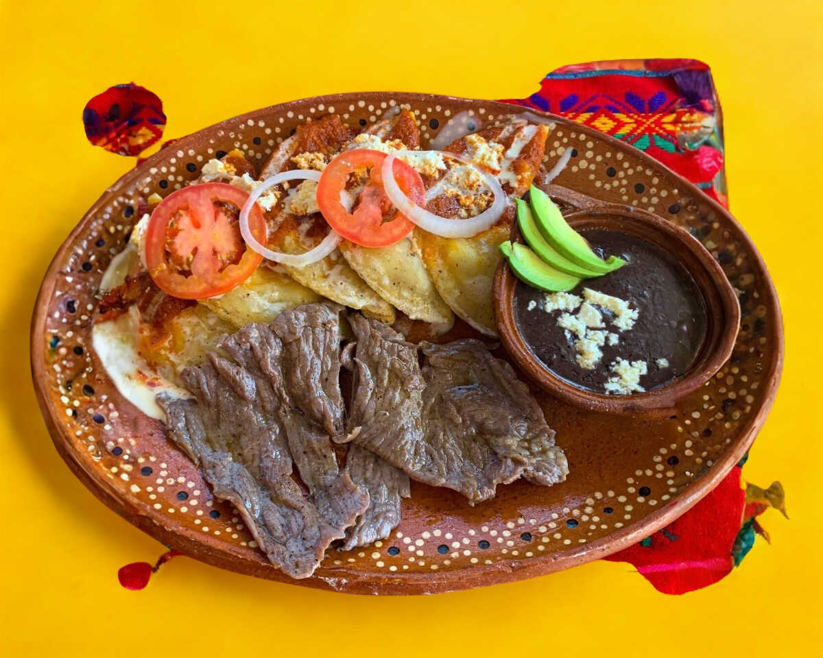 Suave Tira de Cecina, acompañada de queso panela a la plancha, rajas de chile pobano y cebolla, guacamole, frijoles refritos y 3 enchiladas huastecas