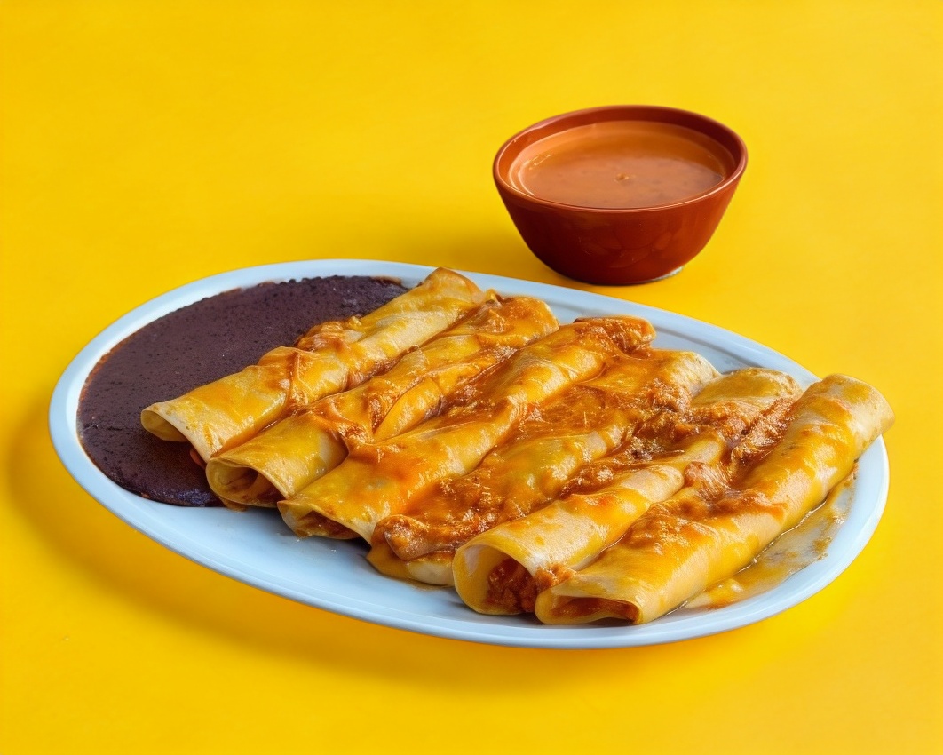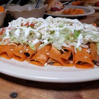 Taquito rojo con base de frijol o papa y carne deshebrada con lechuga tomate queso crema y papas