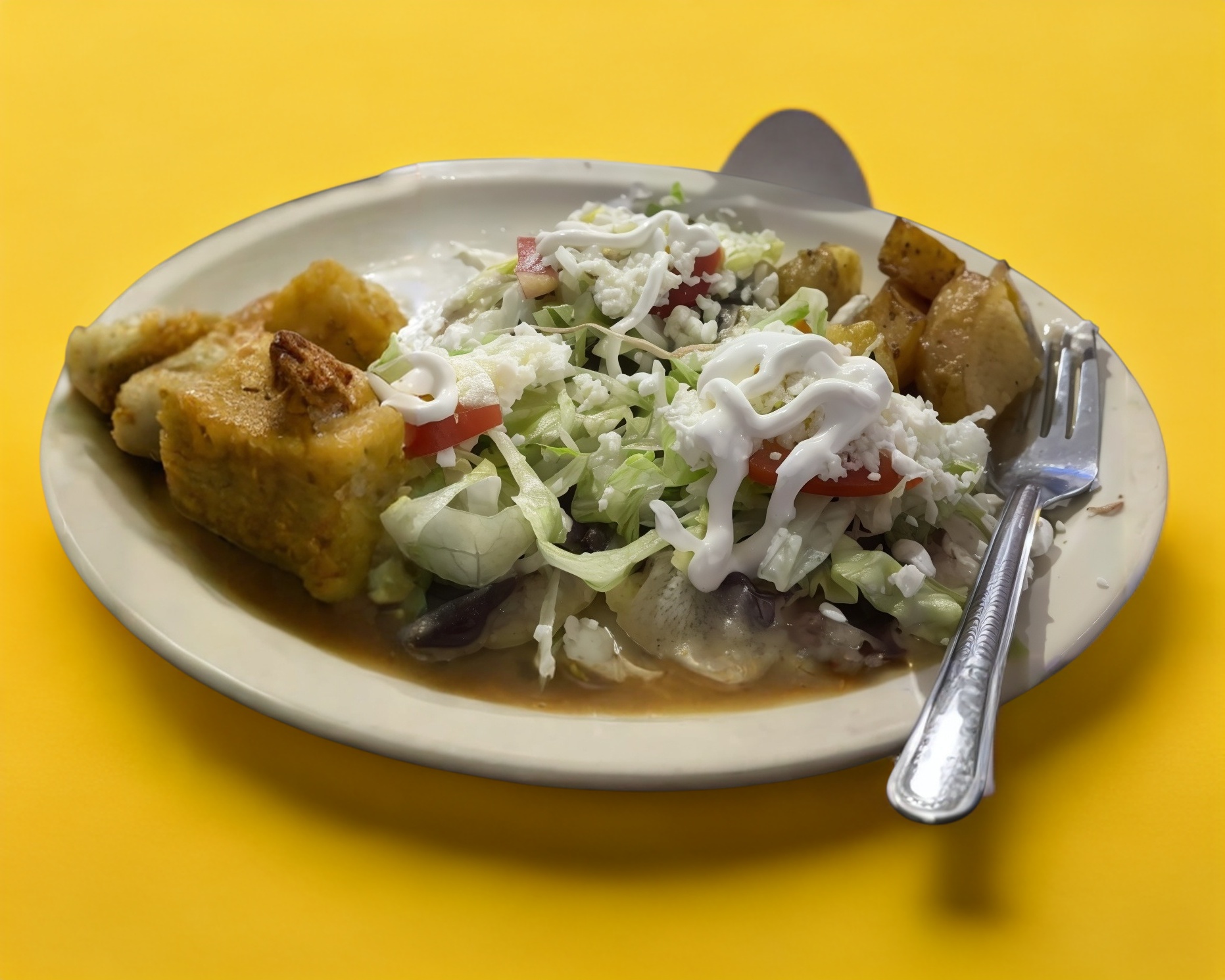 Quesadillas de queso molido acompañados con lechuga tomate queso crema y papas