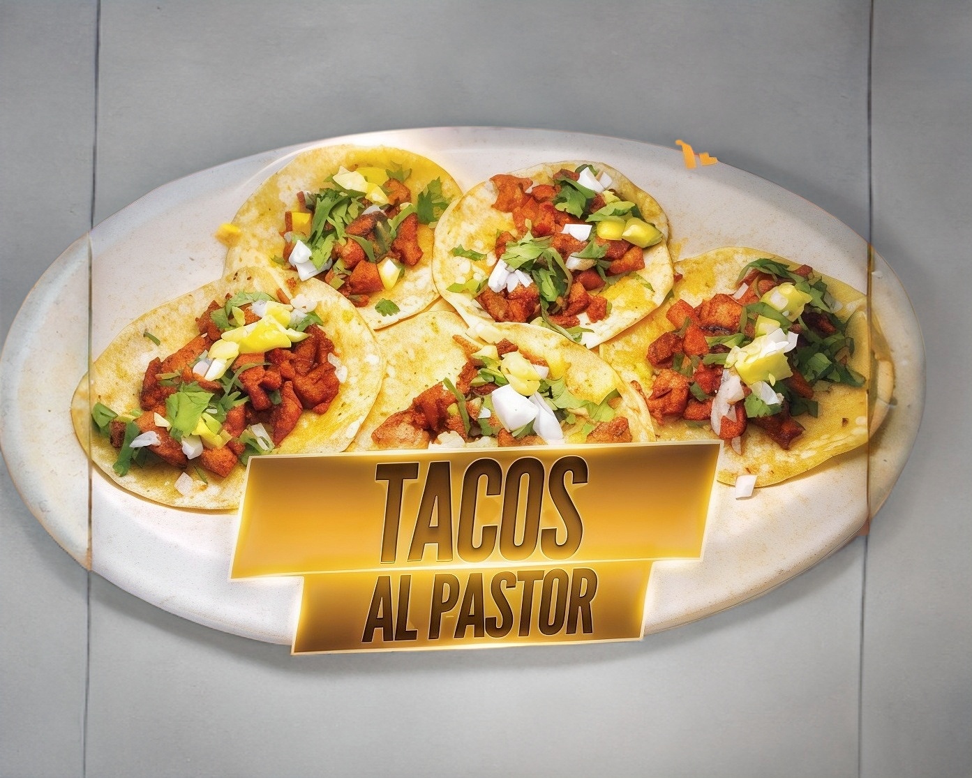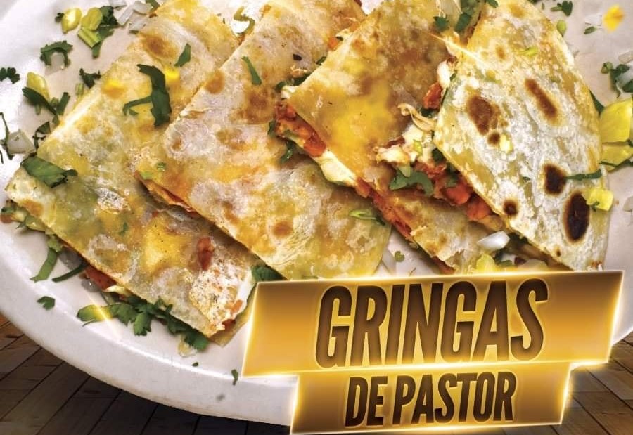 3 Gringas al pastor en tortilla de harina con carne al pastor, cilantro, cebolla, piña y queso asadero.