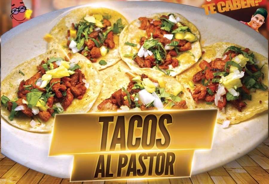 10 Tacos de trompo con cilantro, cebolla, piña y salsas.